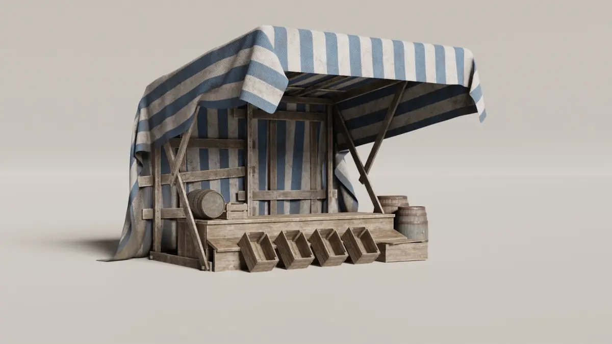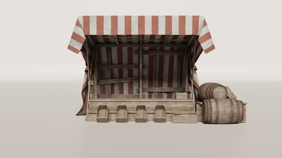 A set of assets for recreating a medieval market, includes: 1 wooden structure,1 cloth with 4 different materials, both Hi poly and decimated.1 barrel with 2 different materials,3 Boxes1 stand table,1 table and bench (available here on cgtrader as "medieval table with bench 2 )