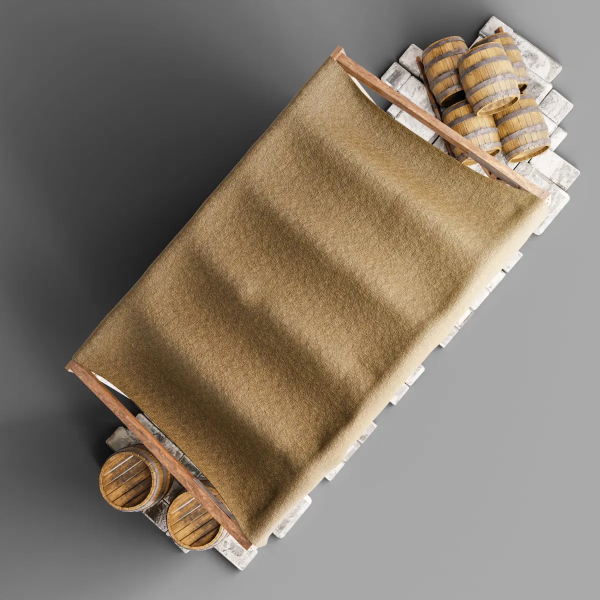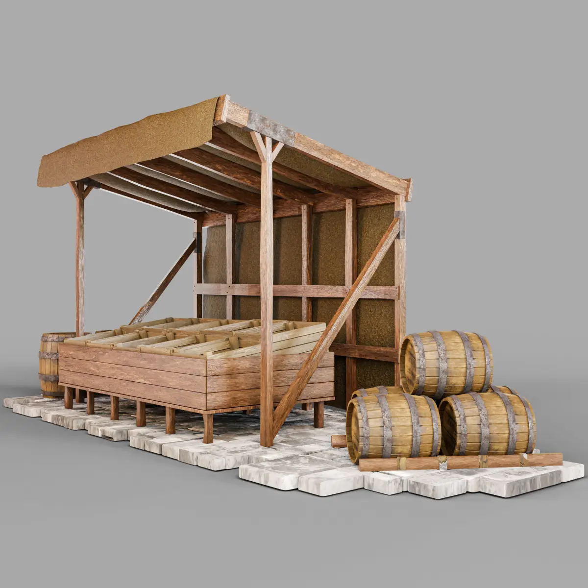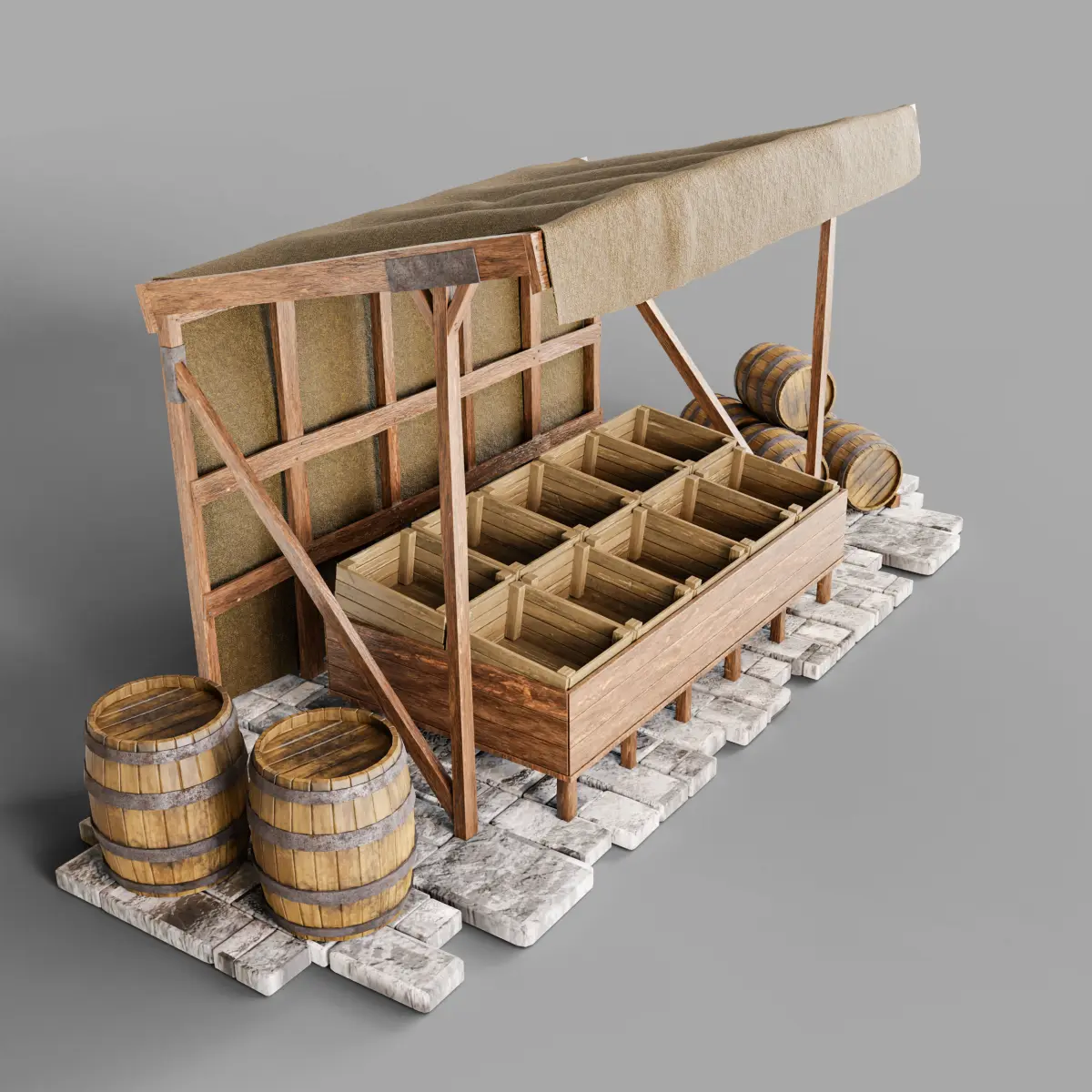 Detailed Medieval Market Vegetable Stalls Tent Pack fully textured, sculpted and rendered. Tent,Table,Barrel,Crate Stand,Stone, Crate empty.
