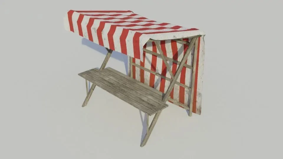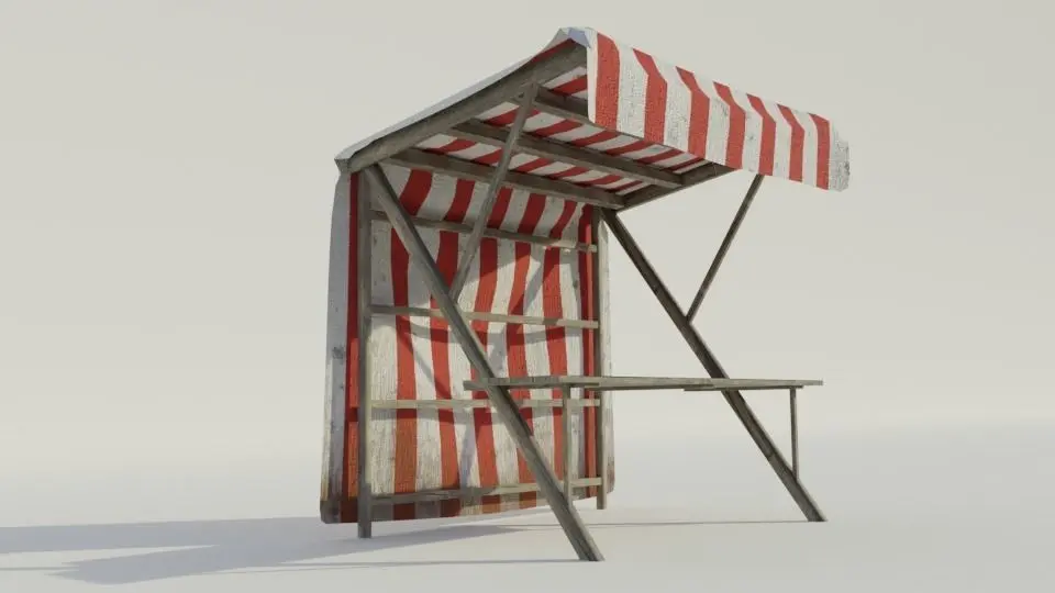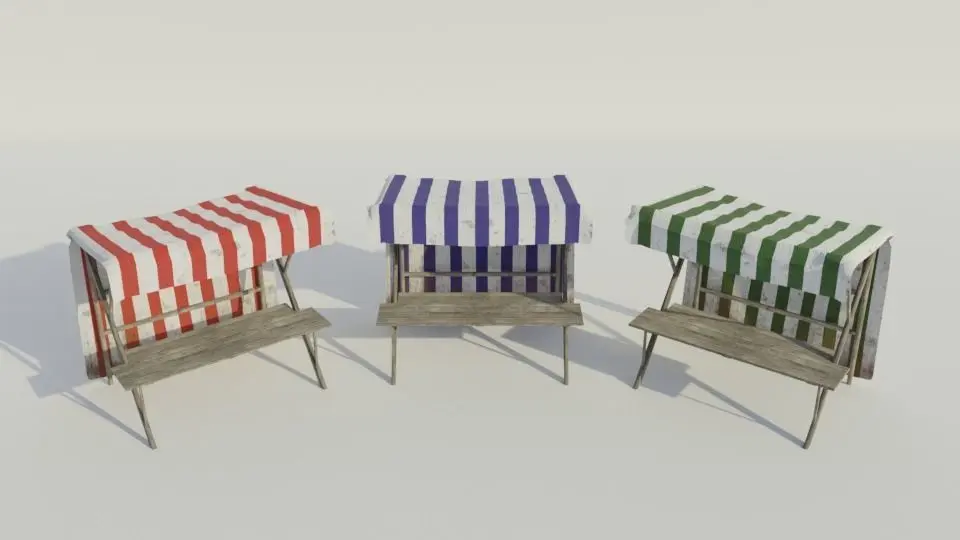 A high quality, lowpoly model of a medieval market stall, it is low poly with only 1261 polys and 1413 verts. The textures are 4k PBR with 3 different diffuse, a normal and a roughness map.