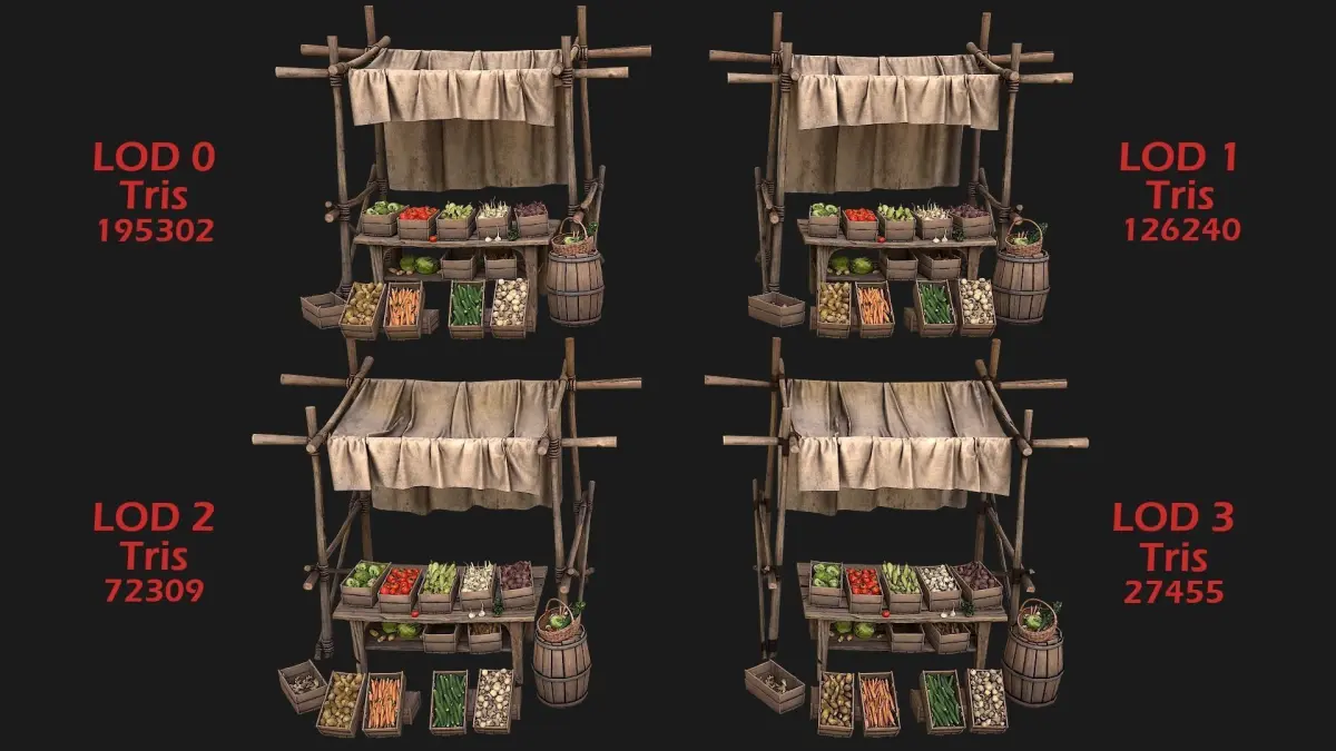 Game ready FBX models.Stylized and detailed Medieval Market Vegetable Stalls Tent Pack fully textured, sculpted and rendered with Physical based rendering (PBR) - Shown images have been rendered in Marmoset Toolbag .The models contains lods, detailed information on the images. The set contains 44 models:Tent,Table,Barrel,Basket, BasketMushrooms ,Basket with Vegetables ,3 Champignons,Bunch of Greenery,Beet,3 Tomatos,2 Marrows,Cabbagehead,4 Potatos,2 Gingers,4 Carrots,2 Cucumbers,2 Garlics,Champignons crate, Beet crate, Tomato crate,Cabbagehead crate, Marrow crate, Potato crate, Ginger crate,Cucumbers crate,Carrot crate,CarrotDirty crate,Garlic crate, Crate Stand,Crate empty.