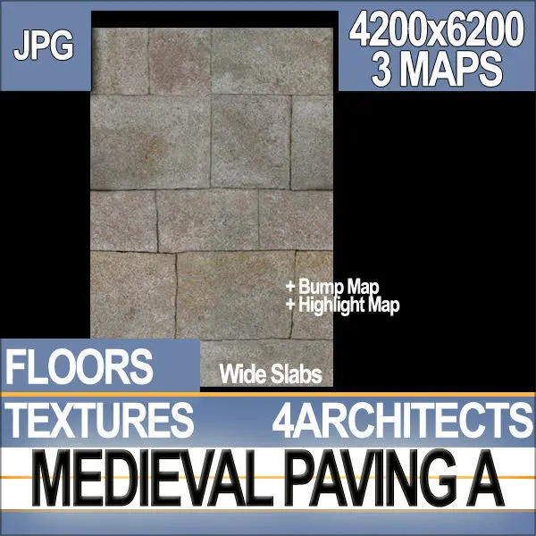 In the package you will find:1- Texture Seamless Medieval Paving A [4200x6200];2- Medieval Paving A Bump MAP [4200x6200];3- Medieval Paving A Highlight MAP [4200x6200].