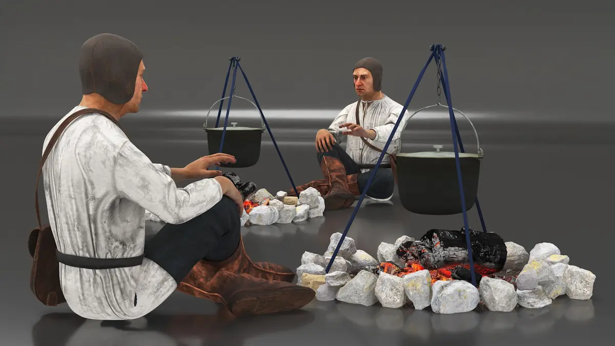 Medieval Peasant by Fire is a three-dimensional model of medieval peasant at a fire with a tripod and a cauldron, depicting a common scene of daily life in the Middle Ages.