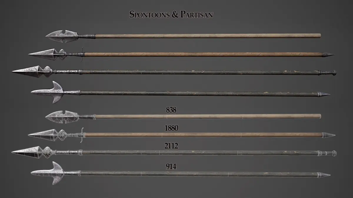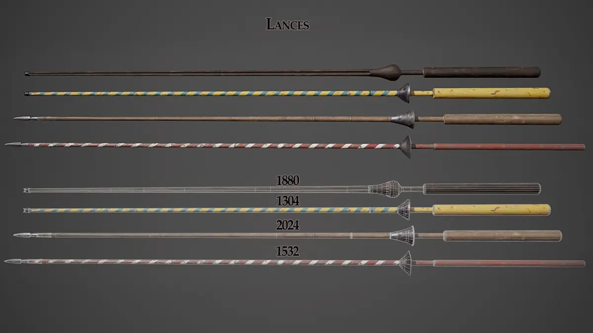 The Medieval Polearms weapon pack includes assets of lance, pike, half-pike(spontoon), partisan, glogger, spear, raunceur and ahlspiess.