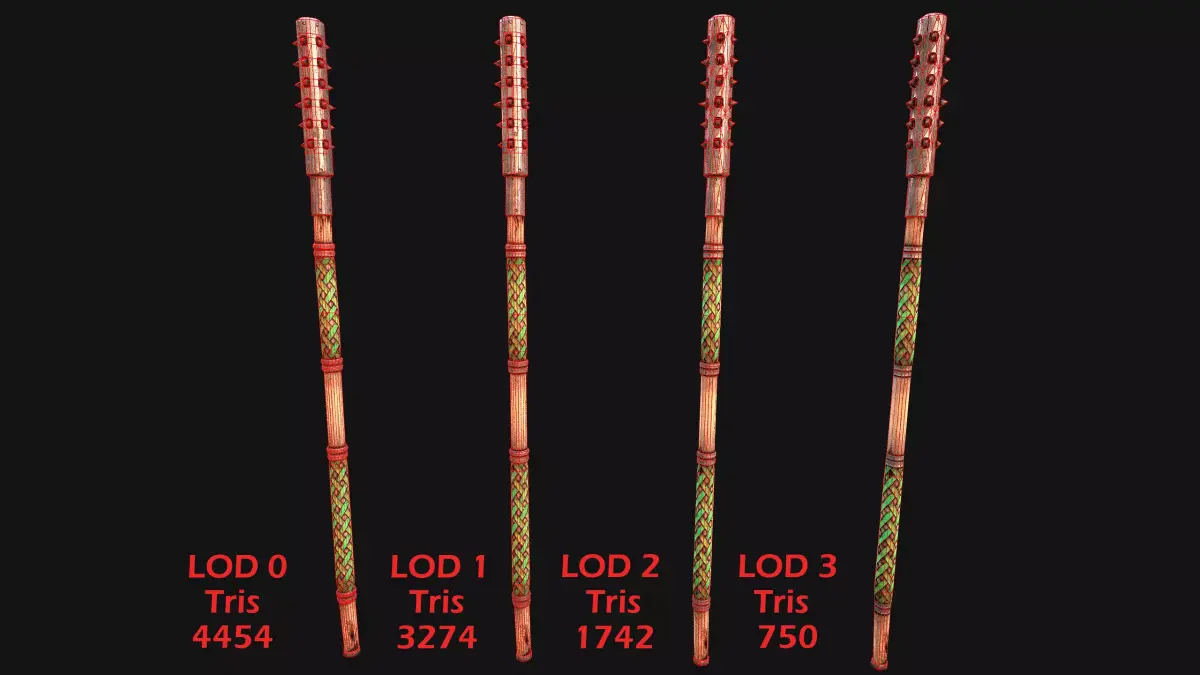 Game ready model .The model contains lods, detailed information on the images.Stylized and detailed Medieval Polearms Crushing Mace fully textured, sculpted and rendered with Physical based rendering (PBR) - Shown images have been rendered in Marmoset Toolbag .The model has 4 color options.