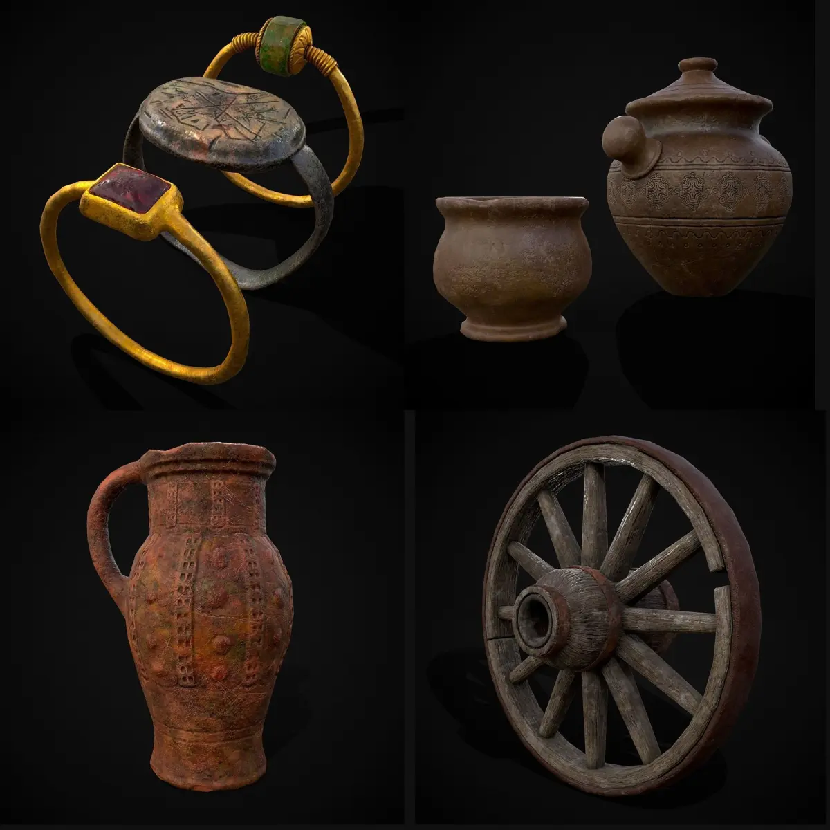 Medieval Prop Mix Fifty Seven - 3D Models- Files Include FBX and OBJ. Includes PBR Texture in 4096 x 4096. - Maps include : Basecolor, Normal, Roughness, Height and Metallic. All Preview renders were done Marmoset Toolbag 4. Scaled to real world scale. Customer Service Guaranteed. From the Creators at Get Dead Entertainment. Please like and Rate! Follow us on FaceBook and Instagram to keep updated on all our newest models. Model can be used for any purpose except resale or redistribution of the asset if not used in a game, commercial or media project.