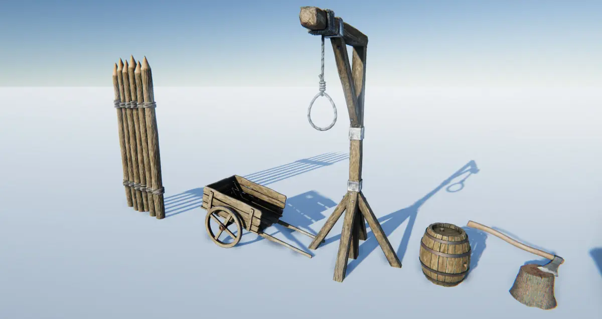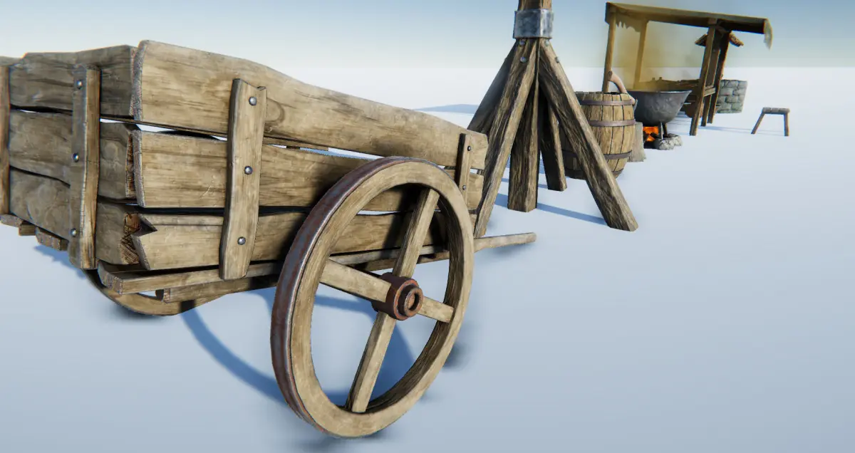 Medieval Props Set with various assets. Well, barrel ,pot, basket, axe with stump, cauldron, chair, handcart, store with drawers with different vegetables .Texture sizes small object 2048x2048, big object 4096x4096 pixels PBR textures.In the Unity version cloth simulation for store, particle effect for fire and smoke, setuped prefabs also.Unreal version also available.