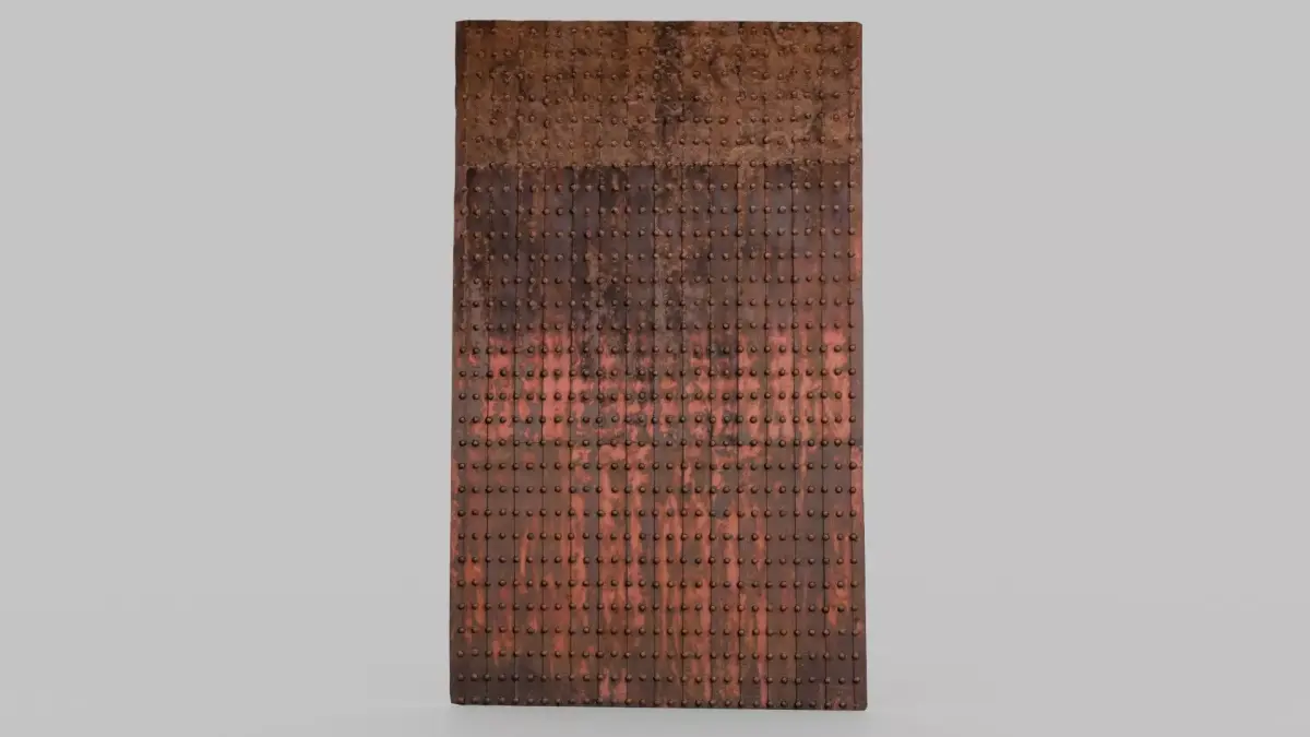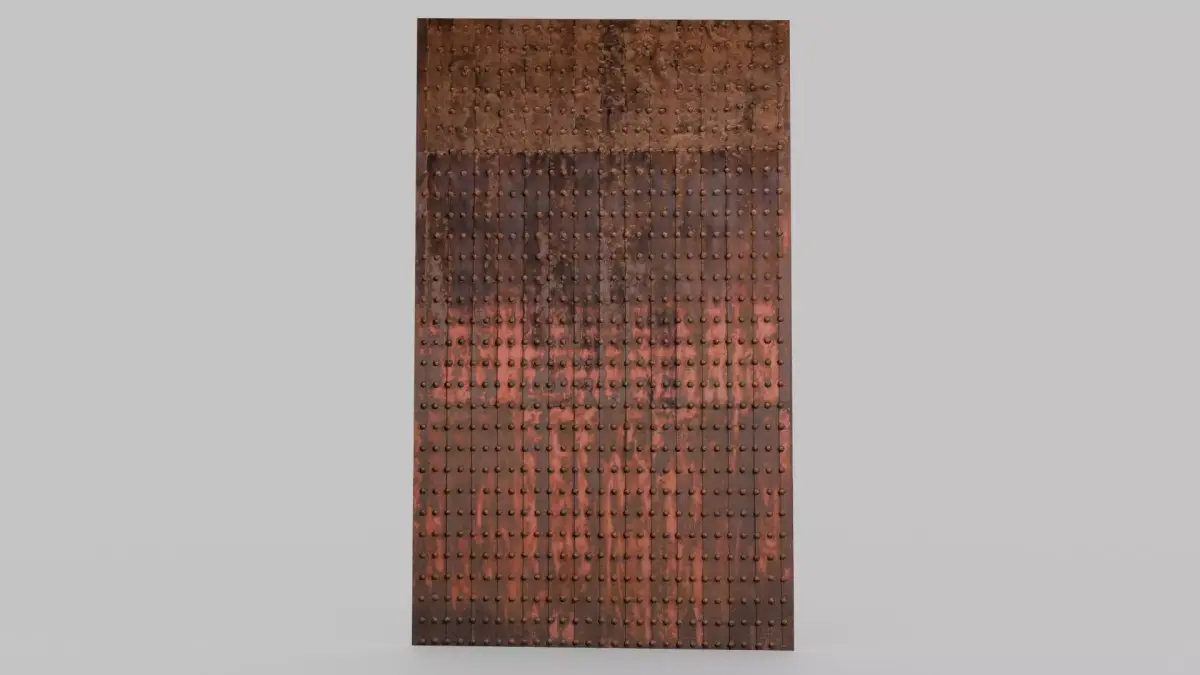 Photogrammetry scan of a medieval iron gate panel with grid-pattern riveted studs. Heavy rust and oxidation patina across surface. Includes 8K diffuse and normal maps, plus two mesh versions: triangulated high-poly and baked normal plane.