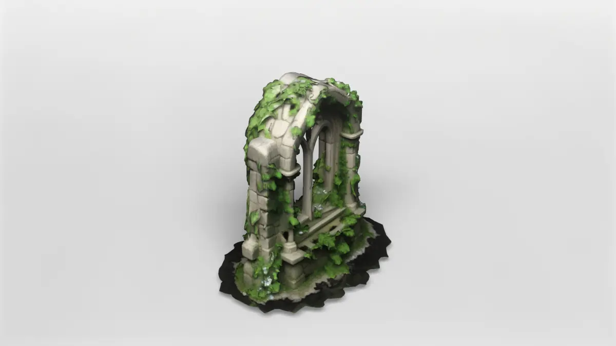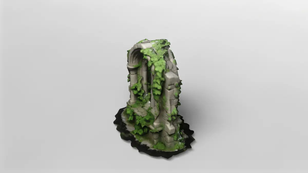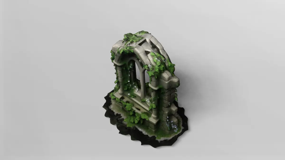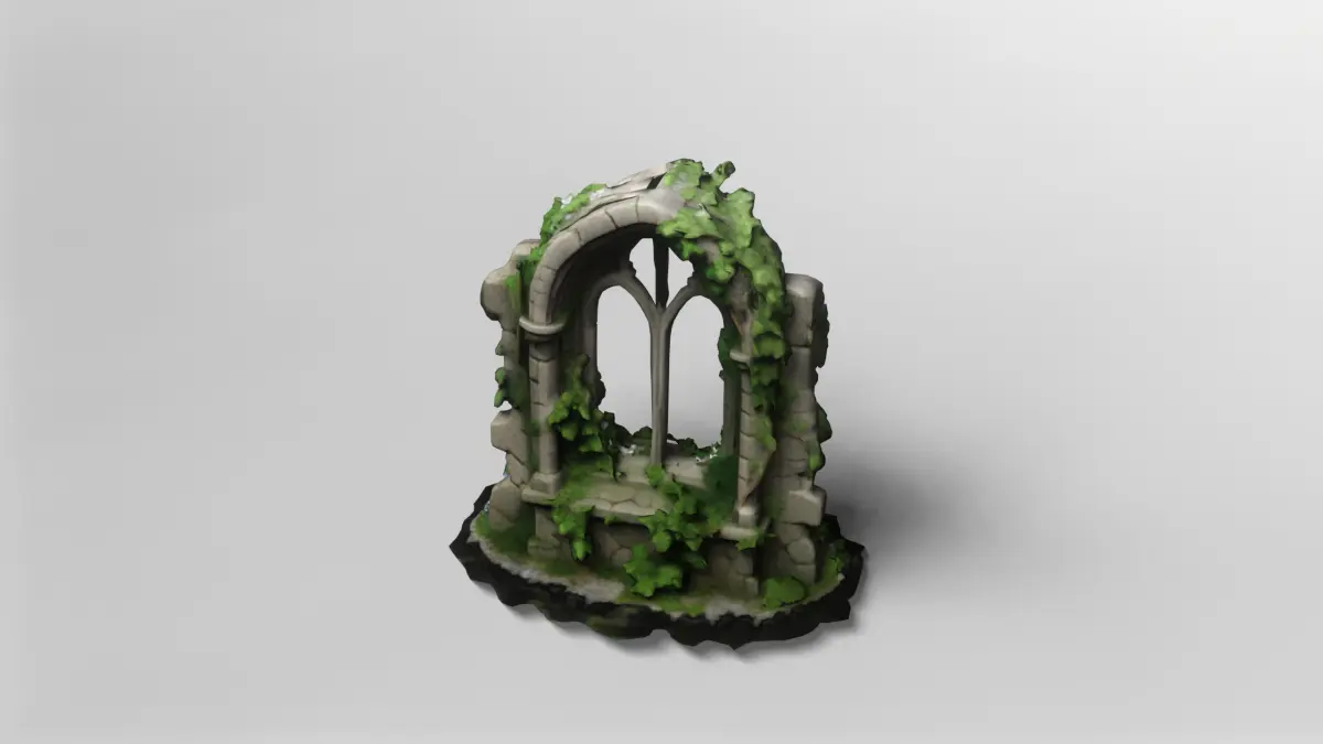 This highly detailed 3D model depicts a medieval ruined window arch, crafted in the Gothic architectural style. The arch features pointed windows and intricately modeled stonework, with realistic cracks and weathering that suggest centuries of exposure to the elements. Climbing vines and lush greenery wind through the structure, adding a sense of life and nature reclaiming the ruin.The model is meticulously textured, with a high-resolution texture map included to enhance the realism of the stones and foliage. The weathered stone surface and the organic growth of the vines have been carefully crafted to provide a natural, immersive appearance suitable for close-up renders or as a dramatic environmental asset in larger scenes.This asset is perfect for use in fantasy or historical environments, such as abandoned castles, ancient ruins, or mystical landscapes. Its modular design allows for easy integration into a wide range of projects, from video games to architectural visualizations and cinematic animations.The model is available for download in gmb format, with the texture included for immediate use. Additionally, it is also provided in fbx format, ensuring compatibility with most major 3D software packages and game engines. This makes it a versatile and ready-to-use asset for your creative workflows.