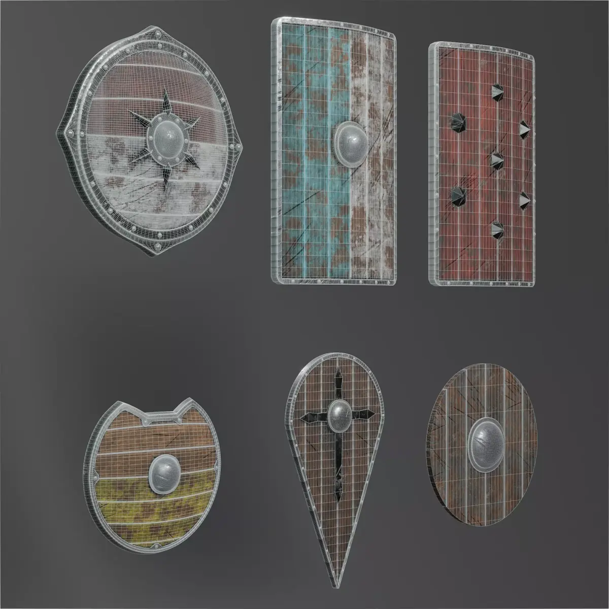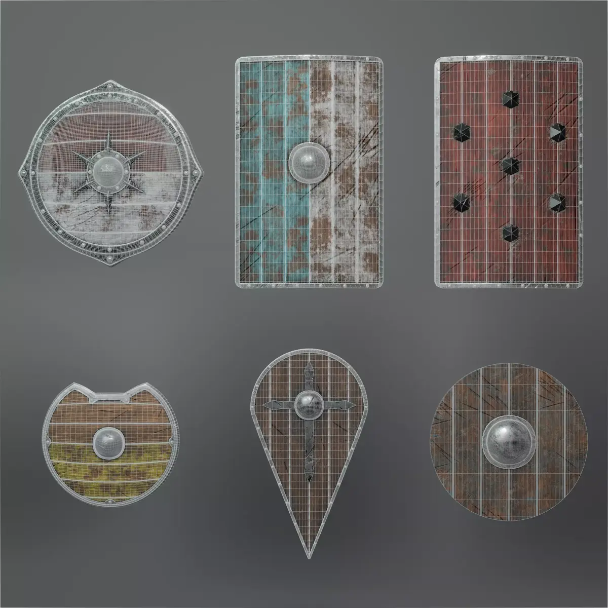 The set features a versatile variety of shield types commonly used in medieval warfare: