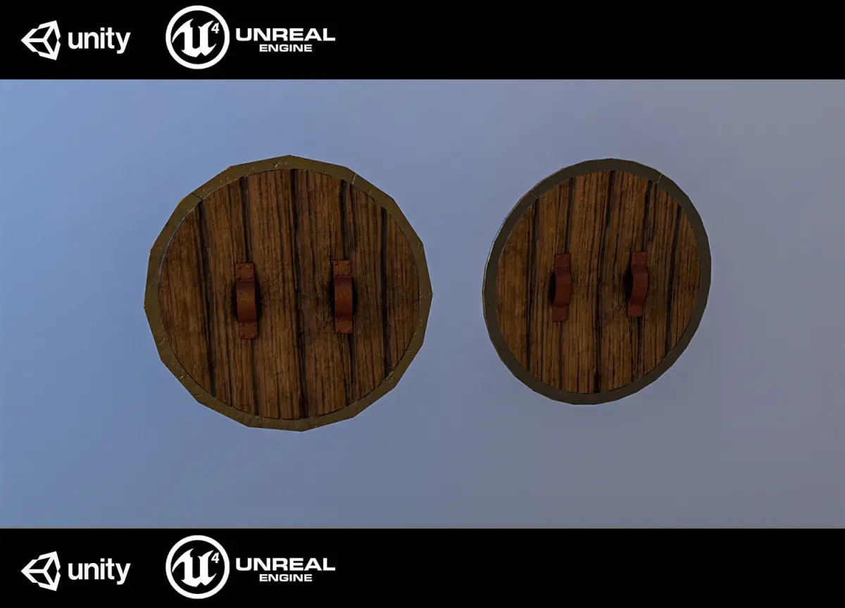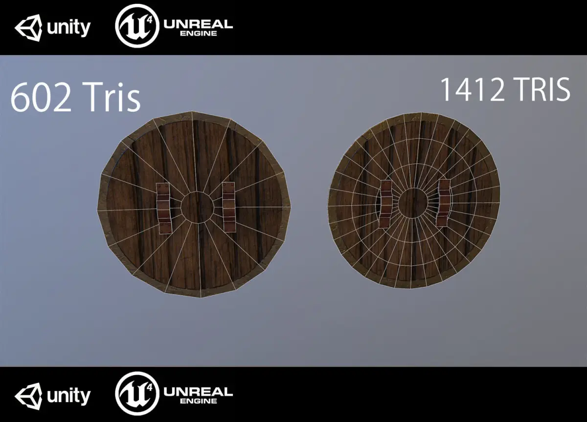 Medieval shield , made low poly , optimized even for mobile games . have two versions , one that has 1412 tris and one around 602 . they use the same material .