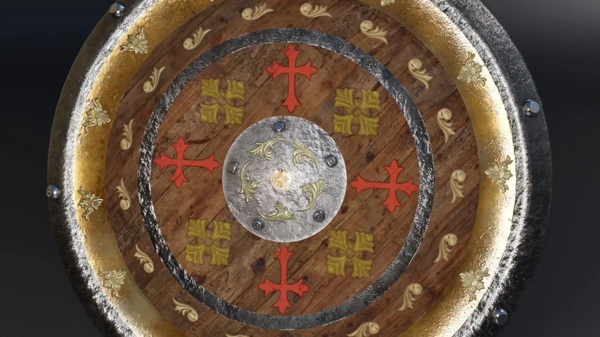 High quality 3D Medieval shield, suitable to add to any medieval screne, good quality wood, metal and gold finish, with clean topology. - 3D model is game ready, tested in Unreal 5.0. - Metallic metal and gold features were added giving the model an ancient look and feel. The shield is embedded with high detail Ornament designs in gold, wood and metal. At the back are leather straps ready for characters to firmly grip the shield. Materials and textures are included for easy rendering. - Fully non-overlapping unwrapped UVs. 4K quality textures used.