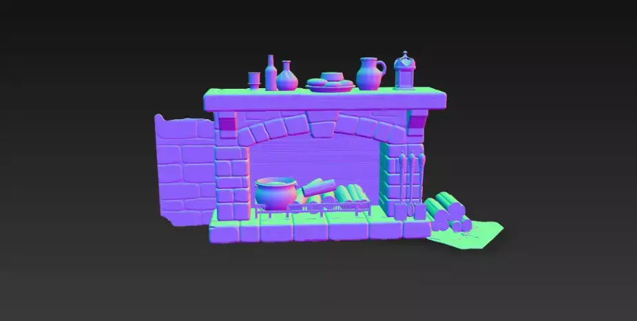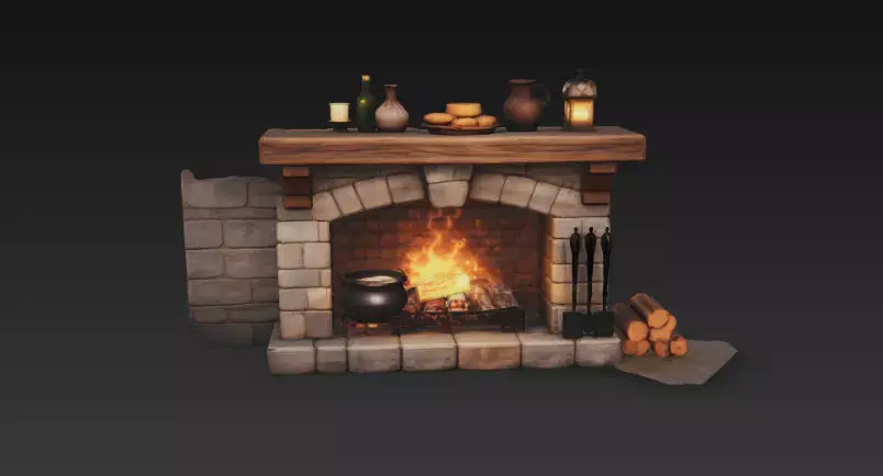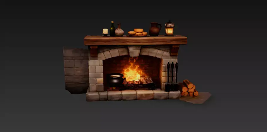 A highly detailed medieval-style stone fireplace environment prop featuring a realistic burning fire, wooden mantel shelf, cooking pot, lanterns, bottles, bread, tools, and stacked firewood.Perfect for medieval taverns, fantasy interiors, RPG environments, dungeon scenes, castle kitchens, village houses, and cinematic renders.