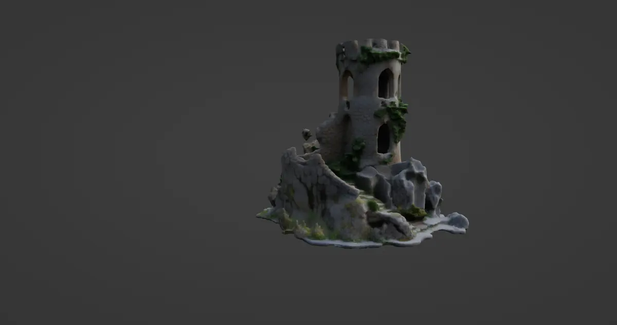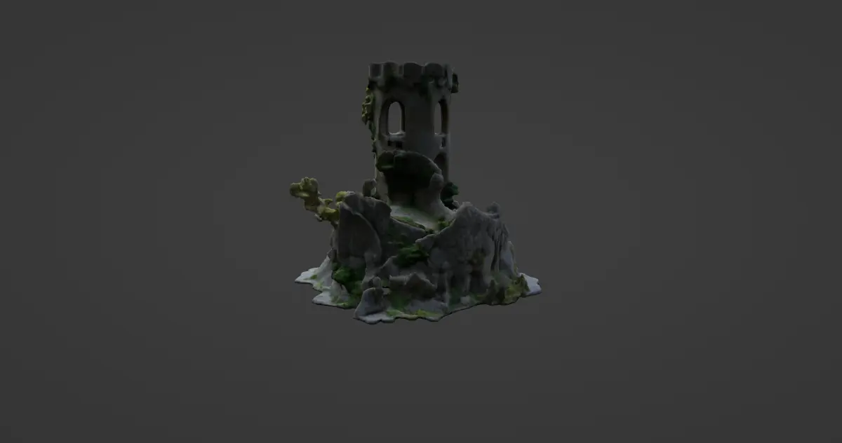This 3D model features a detailed depiction of a medieval stone tower ruin, masterfully crafted to evoke the mystery and romance of a long-forgotten fortress. The cylindrical tower, partially collapsed at the base, stands tall among jagged rock formations and broken stairs that ascend in a serpentine path. The stonework is rendered with high realism, showing individual bricks and mortar seams, adding to the authenticity of the ruin’s decaying structure.Lush green ivy and climbing vines have overtaken much of the tower, curling around its narrow arched windows and spilling across the remnants of the crumbling stone walls. The environment suggests centuries of abandonment, where nature has slowly reclaimed the manmade structure. Moss and small patches of vegetation peek out from crevices between the stones and along the stairway, creating a seamless blend between organic and architectural elements.The model is ideal for fantasy settings, medieval storytelling, or historical recreations. Whether used in a video game, animation, or virtual environment, this tower ruin provides a compelling focal point for scenes of exploration, mystery, or forgotten lore. Its dramatic silhouette and environmental integration make it visually captivating from all angles.This model is downloadable in .gmb format, with texture files included for immediate use. It is also available in .fbx format for compatibility with a wide range of 3D applications and game engines.