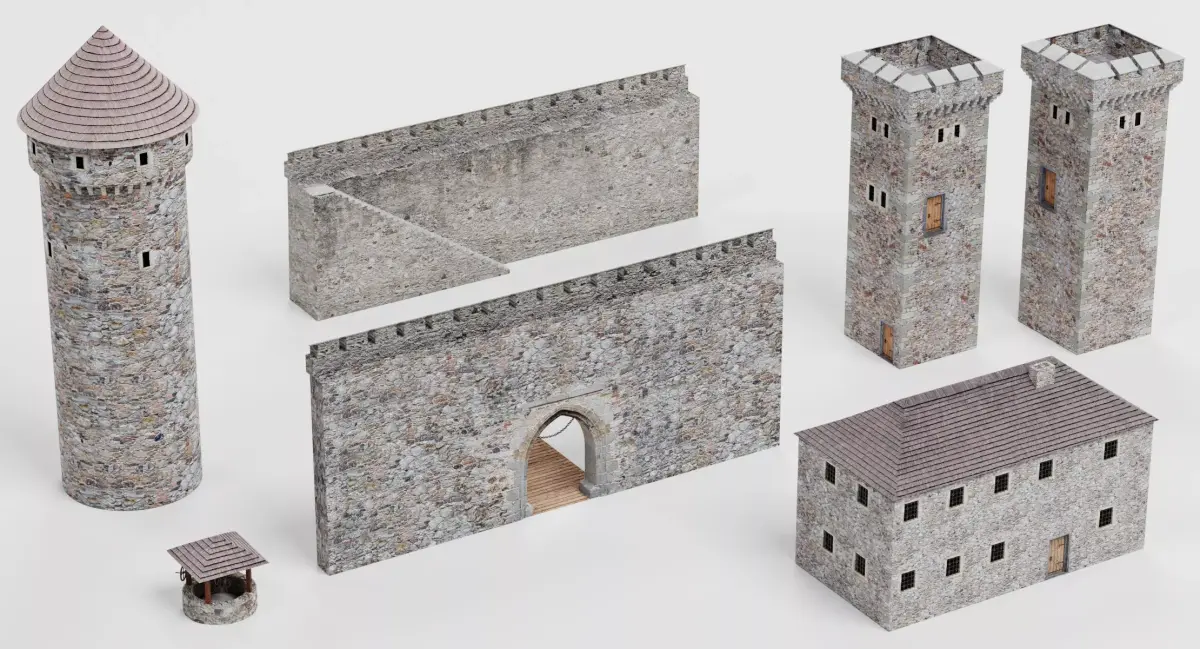 || SPECS ||-This model contains 7 separate objects (3 Towers,Gate,Wall,House and Well).-This model contains 116,695 polygons and 115,520 vertices with subdivision turned OFF.