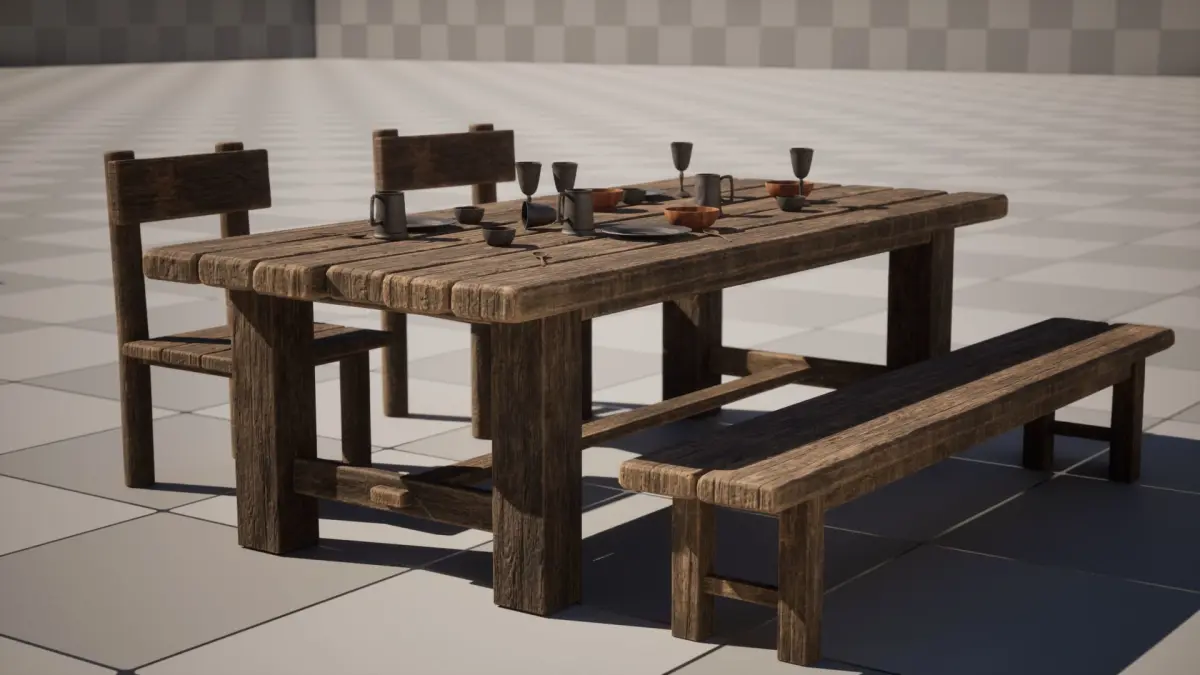 This UE5 asset pack includes a wooden table set and dining ware crafted for use in Medieval/Fantasy game environments. Compatible with Unreal Engine 5.3 and above. Also includes FBX, OBJ, and STL formats.