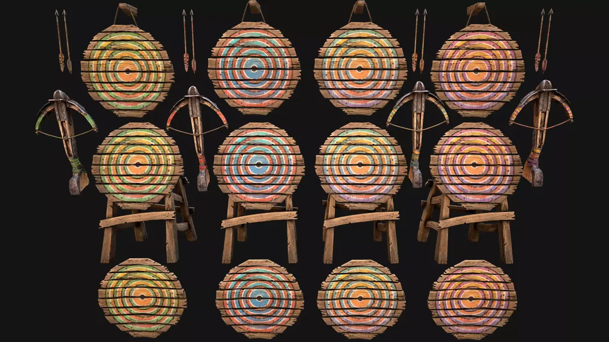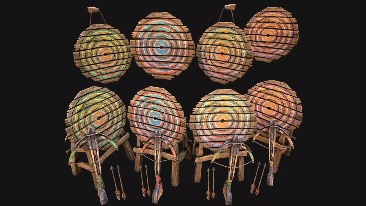 Game ready models .The models contains lods, detailed information on the images.Stylized and detailed Medieval Crossbowman's Set fully textured, sculpted and rendered with Physical based rendering (PBR) - Shown images have been rendered in Marmoset Toolbag .The set contains: Target, target on a rope, target on a wooden stand ,Crossbow , 2 arrows .