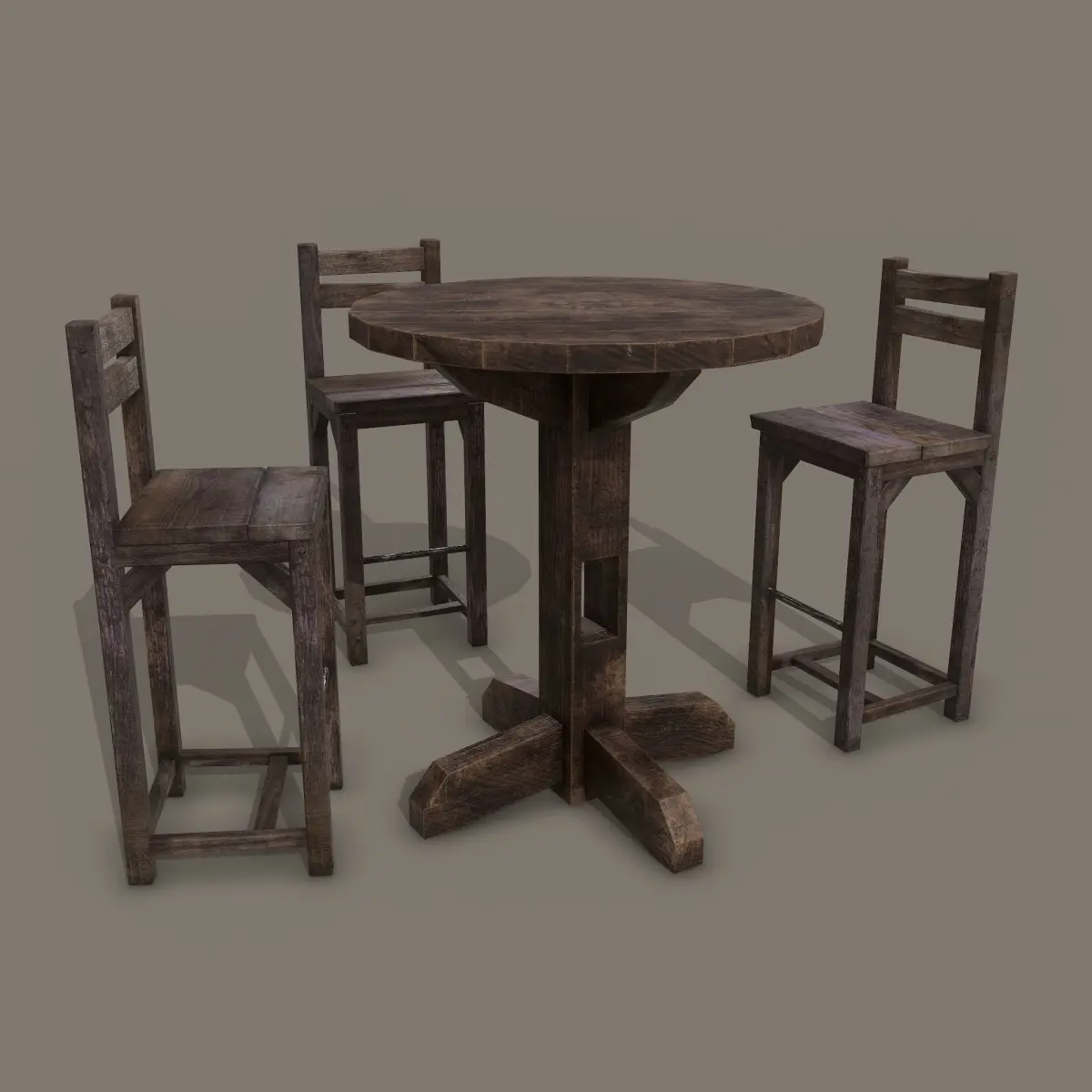 Table : Polygons 543 Vertices 580 Round Tavern Table 3D Model PBR Texture available in 2048 x 2048 and 4096 x 4096 Maps include : Basecolor, Normal, Roughness. All Preview renders were done Marmoset Toolbag 3.08 Scaled to real world scale. Chairs: Polygons 552 Vertices 764 Wooden Tavern High Chairs 3D Model PBR Texture All Preview renders were done Marmoset Toolbag 3.08 Scaled to real world scale.