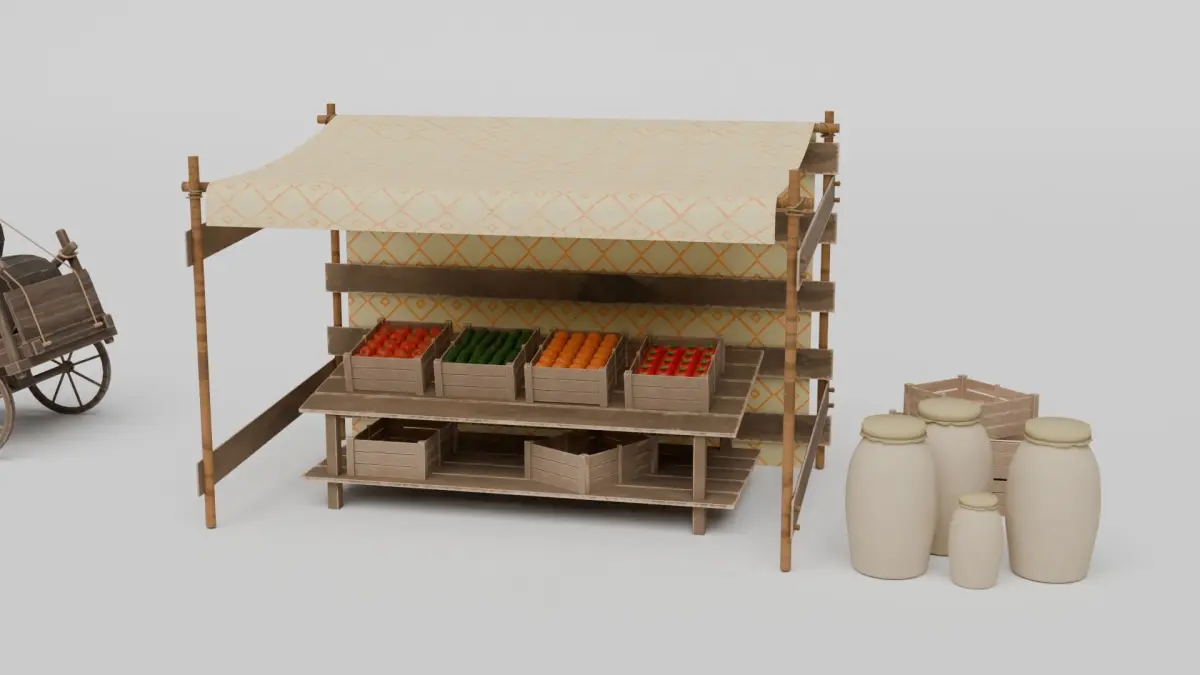 Set Contents:Forge and forge toolsWooden wellMarket stall with fruit and vegetable cratesBarrels and barrel cartWooden furniture and various accessoriesUsage AreasThis Medieval-themed 3D model set is ideal for use in various areas: