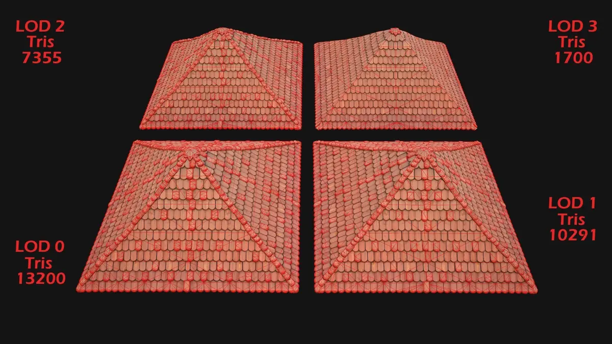 Game ready model Medieval Tile Pyramid Roof .The model contains lods, detailed information on the images.Stylized and detailed Medieval Tile Pyramid Roof textured, sculpted and rendered with Physical based rendering (PBR) - Shown images have been rendered in Marmoset Toolbag .The set contains 1 models of Pyramid roof and 1 model of wooden ceilings .