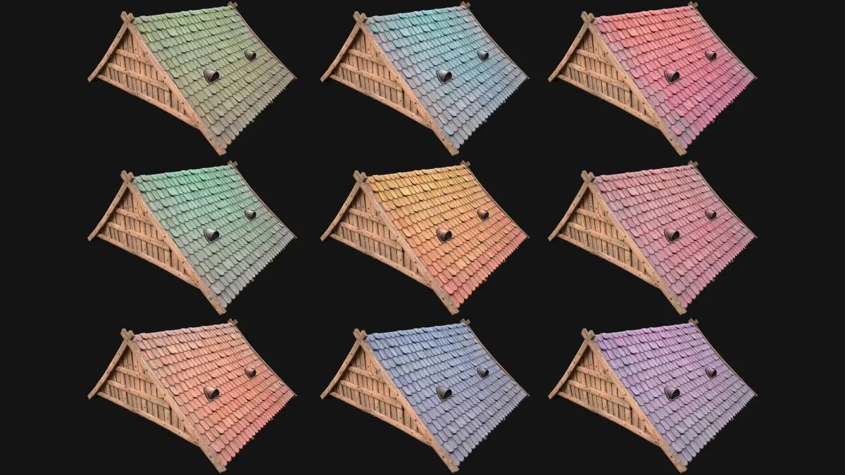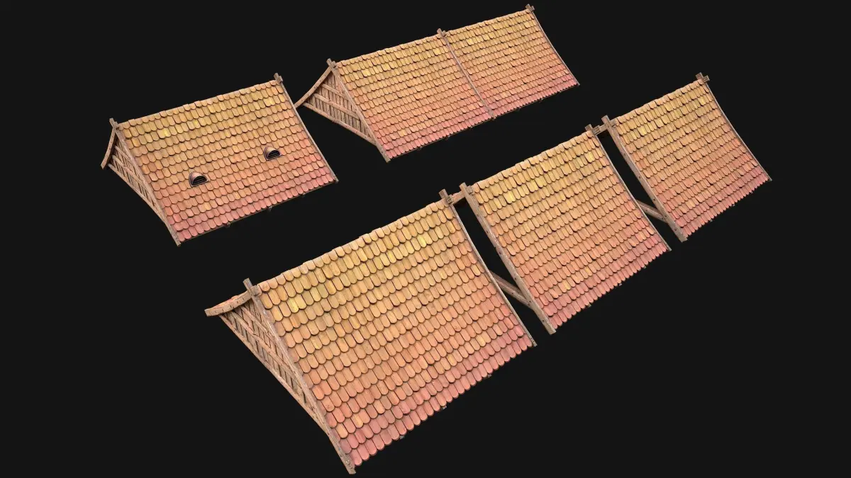 Game ready model Medieval Tile Roof Modular .The model contains lods, detailed information on the images.Stylized and detailed Medieval Tile Roof Modular textured, sculpted and rendered with Physical based rendering (PBR) - Shown images have been rendered in Marmoset Toolbag .The set contains 5 models of roofs with tiles and 3 models of wooden ceilings as well as 1 model of ventilation.