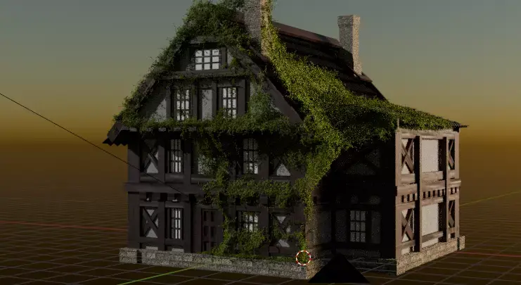Medieval house, timber house, ivy building, fantasy village, rustic cottage, old wooden house, overgrown house, Blender environment, game-ready model, 3D architecture, PBR asset, cinematic building, fantasy scene