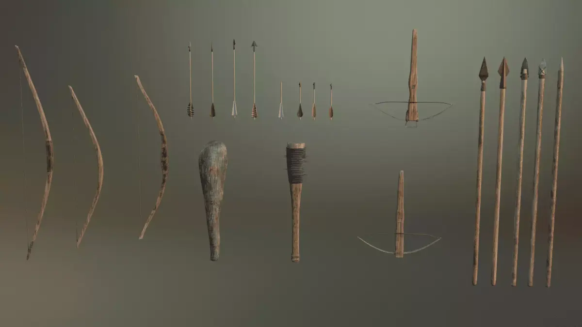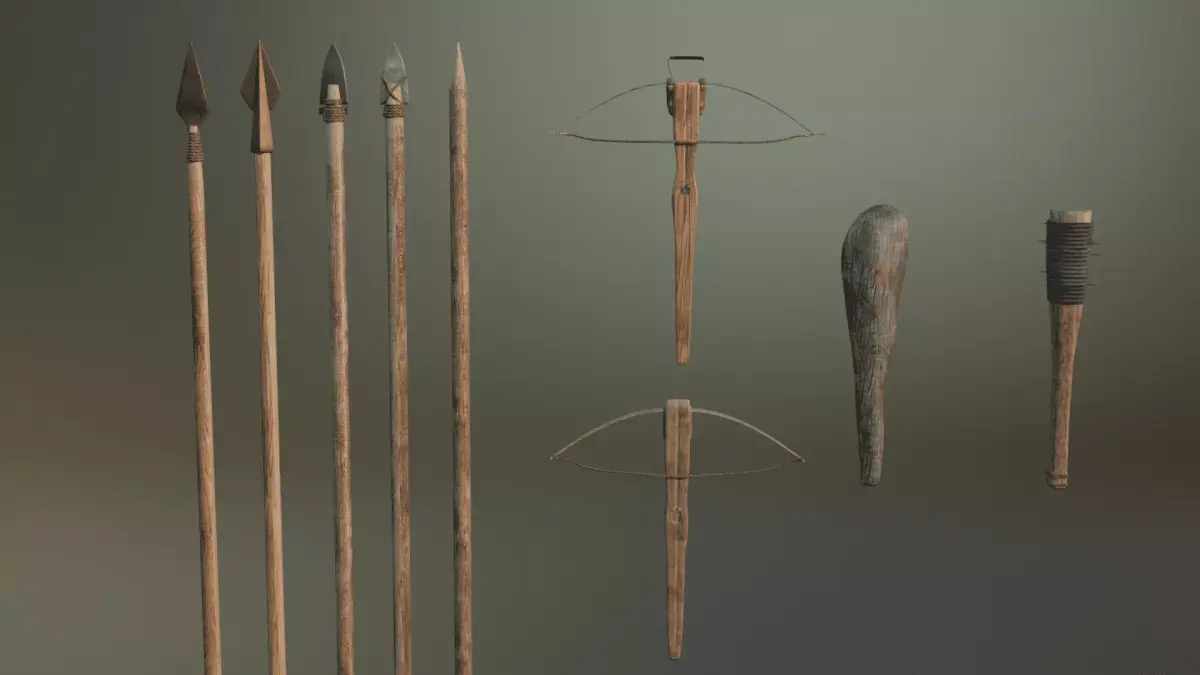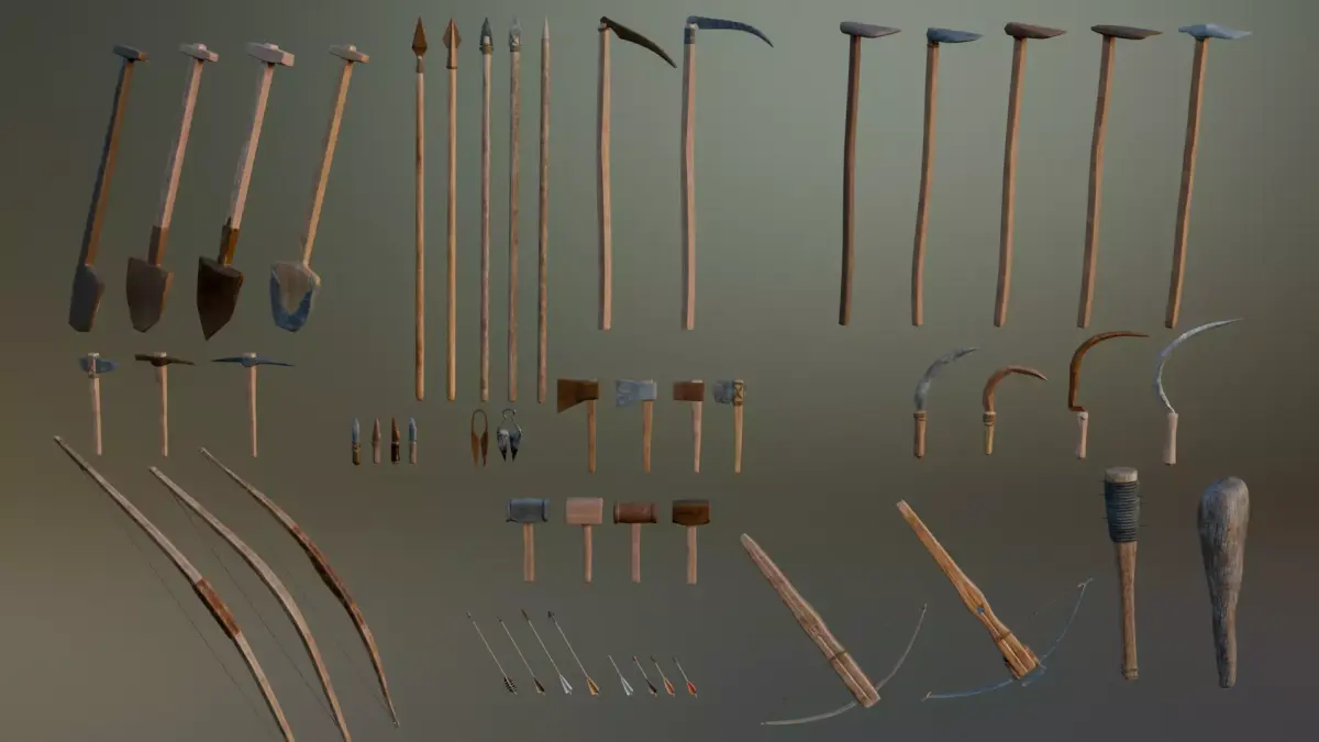 Equip your medieval or fantasy worlds with this detailed collection of handcrafted 3D weapons and tools. This pack includes: -a complete range of bows, crossbows, spears, arrows, bolts, and melee weapons : perfect for arming hunters, or bandits in your scenes.-32 historically inspired tools made from different materials — wood, stone, copper, bronze, and iron — ideal for blacksmiths, farmers, and villagers in your environments.