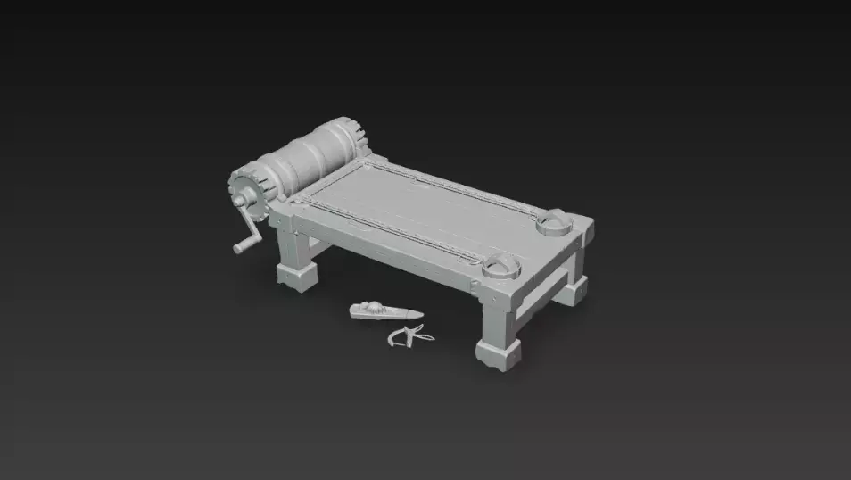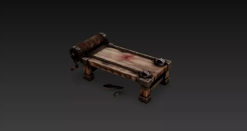 Medieval Torture Rack is a high-quality 3D environment prop designed for games, renders, and dark medieval or fantasy scenes. The model features a heavy wooden rack table, iron restraint cuffs, chain details, rope-wrapped winding drum, metal crank handle, and realistic worn wood and aged metal surfaces for an authentic dungeon look.