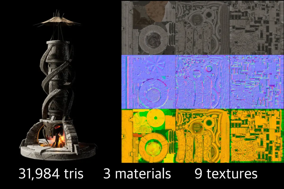 Game-ready 3D model with 3 materials, 9 textures, 1 fbx file, and the textures are all 4k. Textures include: Diffuse, Normal, and an occlusion/metallic/roughness map.