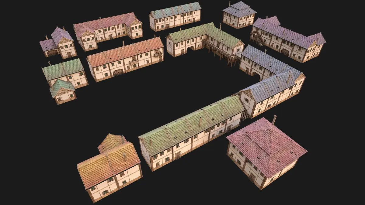 Game ready models Medieval Town Buildings Set.The model contains lods, detailed information on the images.Stylized and detailed Medieval Town Buildings Set textured, sculpted and rendered with Physical based rendering (PBR) - Shown images have been rendered in Marmoset Toolbag .The set contains 5 models of medieval buildings.