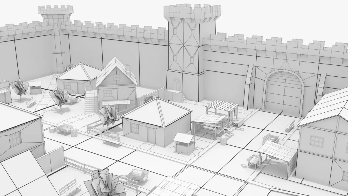 Realistic, high quality and low polygonal 3D model of Medieval Town - Medieval Models pack. This Town Scene Pack is best for use in games and other real time applications. All models and textures are very optimized for use all platforms. Medieval City - Pack models is built with great attention to details and realistic proportions with correct geometry. Package contained big medieval town scene ready to use. Also included many elements for easy and fast create your own scene or level. Medieval pack included more than 55 models - castle walls, doors, houses, trees, roads, foods and etc.. Everything shown in the screenshots.