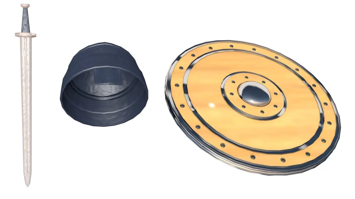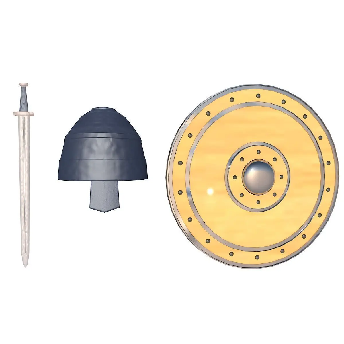 The textures are provided separately in PSD Photoshop file format, ensuring flexibility for future customization. Description: This highly detailed 3D model pack includes a medieval helmet, sword, and Viking shield, perfect for use in games, animations, and virtual reality projects.