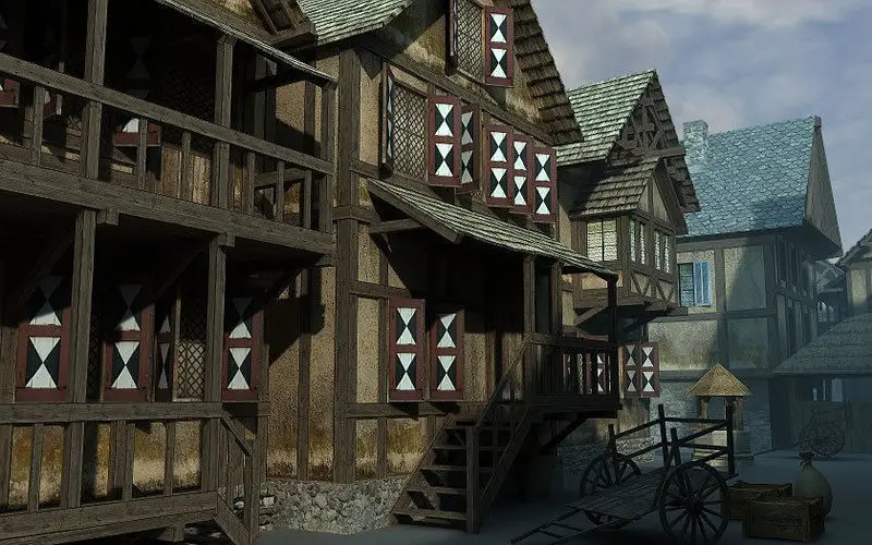Medieval Village 3. Model pack includes 42 models (22 unique + LOD stages) with textures in TGA and PNG format, ready to be used in your 3D works/games. The pack Includes props like houses, barns, balconies, bridges, stairs, lamps and others.