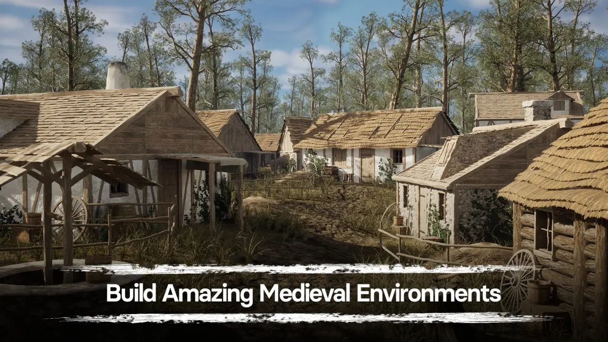 A Medieval Village environment pack. 11 ready-to-use buildings, a diverse set of props, and foliage that will help you shape your environment in no time! The scene showcased in the images above is also included with the pack.