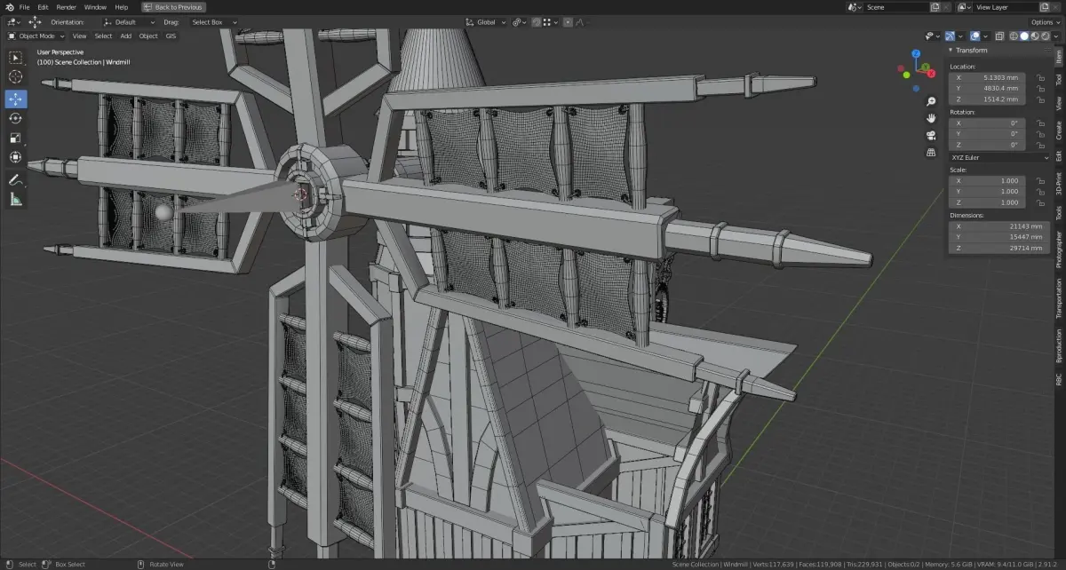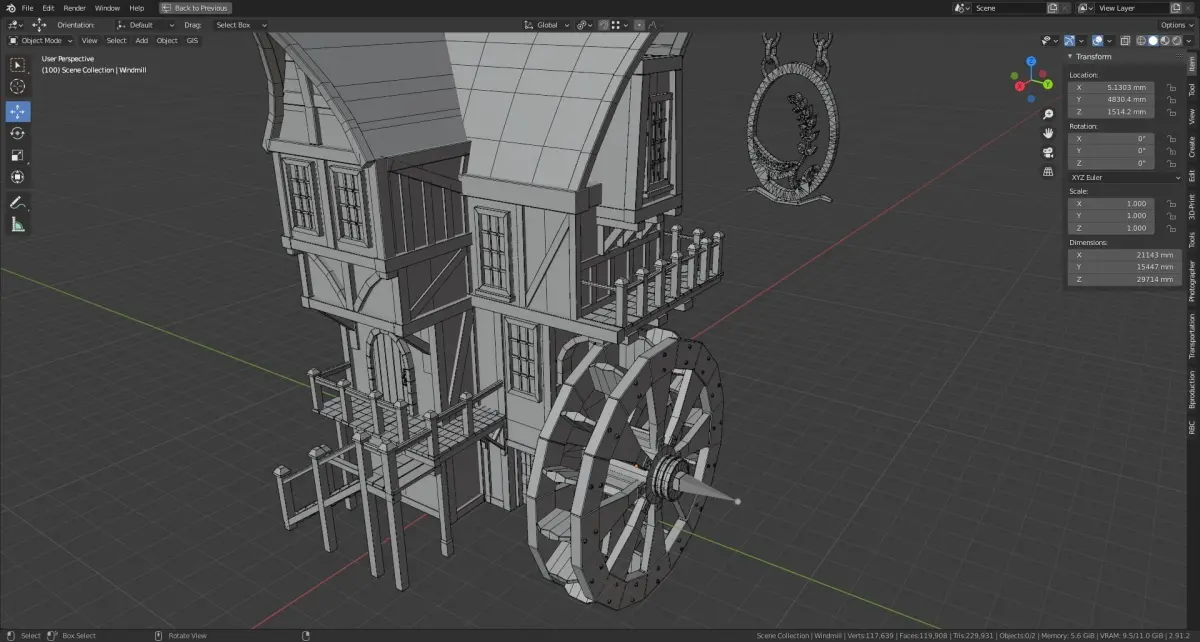 - Rig and Animation done inside Blender. Animated parts are the water wheel, the logo sign and the wind wheel.