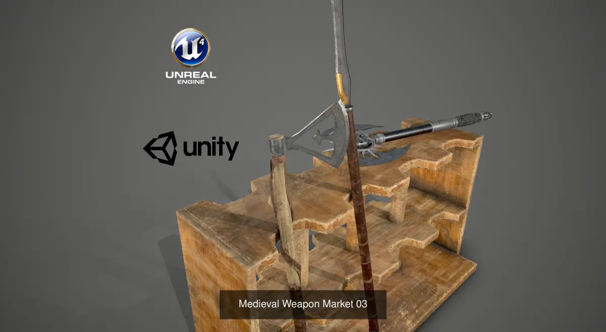 This is a high quality medieval weapon collection including various types of weapons and weapon market. This package contains 17 high quality low poly medieval weapons and 4 weapon market.
