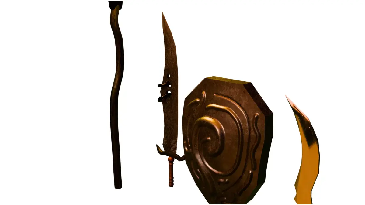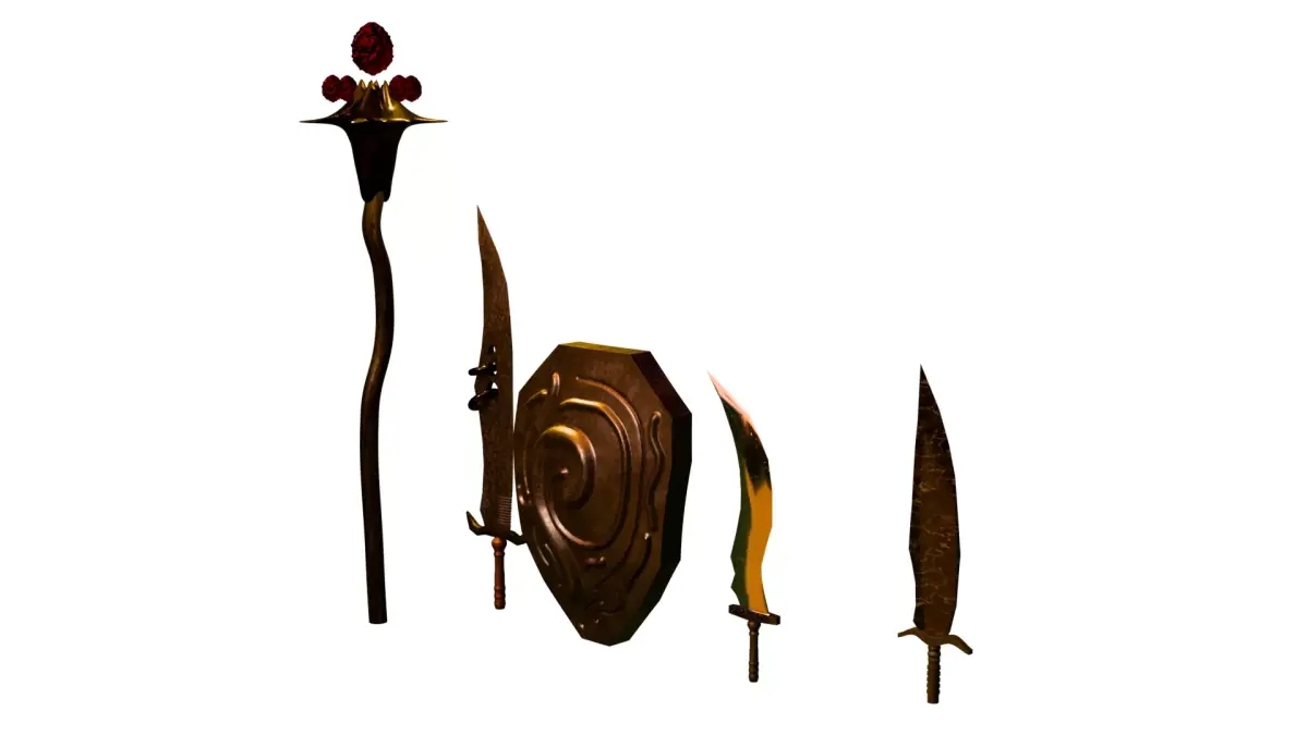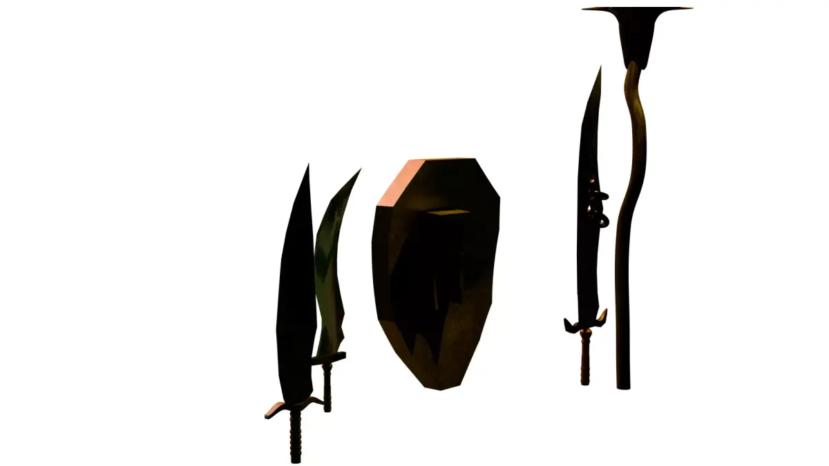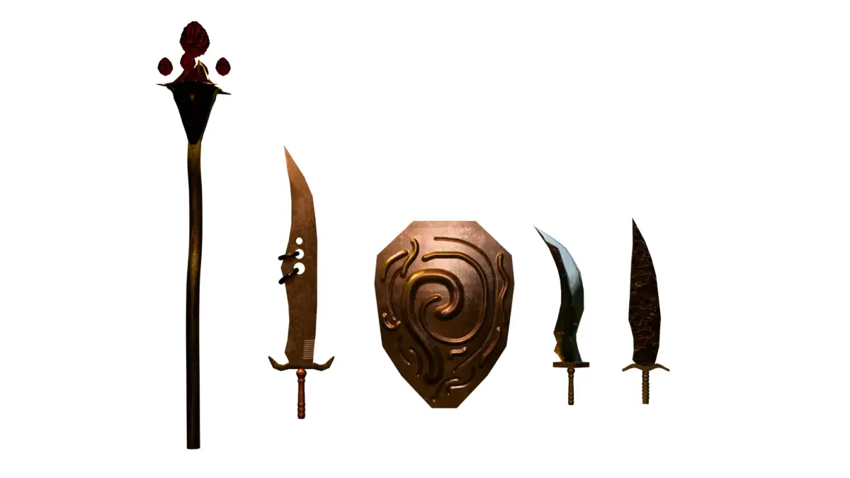 Dark Fantasy Medieval Weapon Pack is a handcrafted collection of stylized weapons designed for RPG, action, survival, and fantasy-themed games.This pack includes a magical staff, ornamented shield, and three unique sword variations, each crafted with attention to silhouette, material richness, and atmospheric presentation.