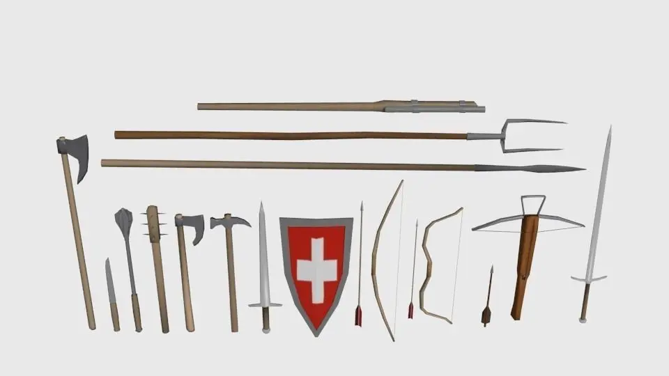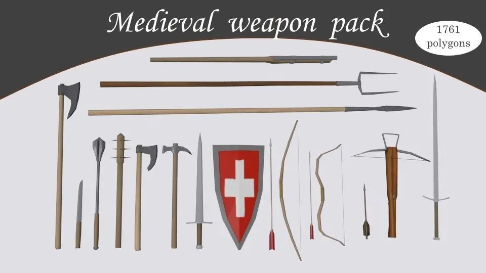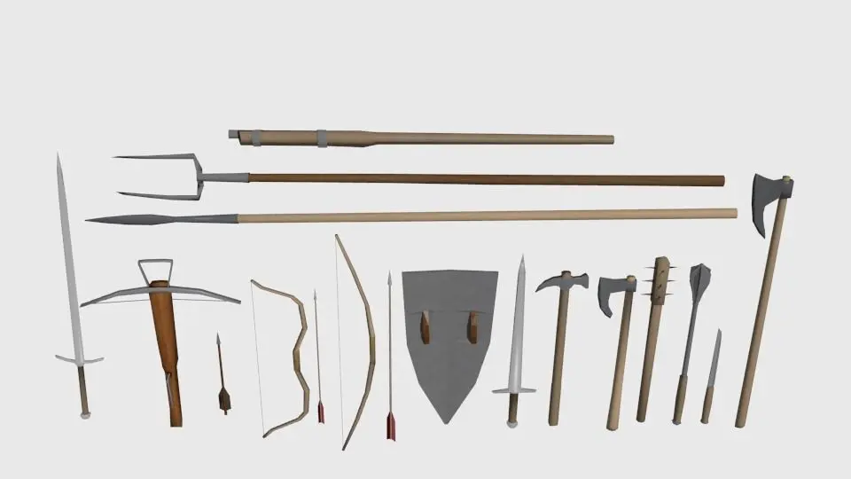Medieval weapon pack includes 15(18) lowpoly models:-early musket;-pitchforck;-spear;-two-handed axe;-dagger;-morningstar;-spiked cudgel;-battle axe;-warhammer;-short sword;-shield;-long bow with arrow;-asian bow with arrow;-crossbow with bolt;-two-handed sword;Polygons:1761