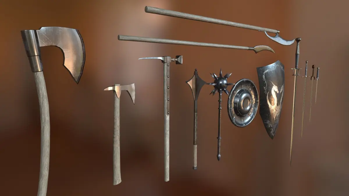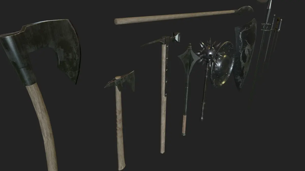 ClaymoreBastard SwordShort SwordMaceMorningstarWarhammerBardiche x2Crest ShieldRound ShieldBeard AxeWar Axe