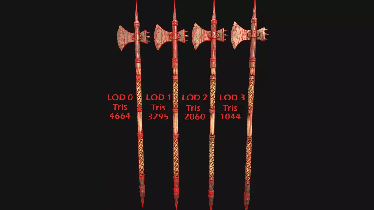 - Tris: 4664(LOD0),3295(LOD1),2060(LOD2),1044(LOD3).