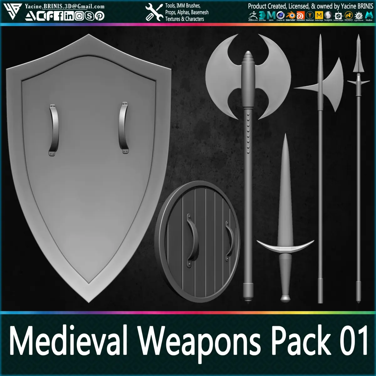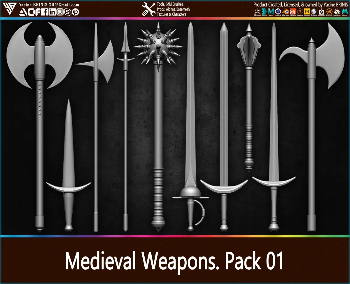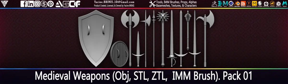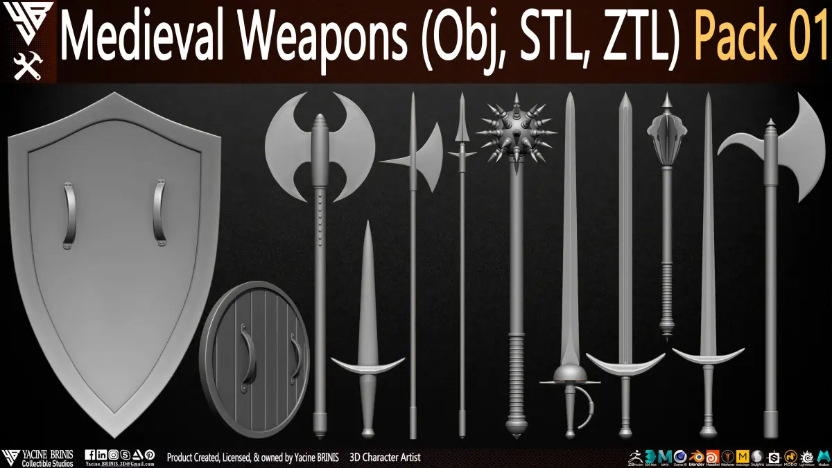 This is a pack of 12 medieval weapons like spear, sword, shield, knife, and tagger you can use for your Characters, for scenes, for video games, mobile games, and movies.