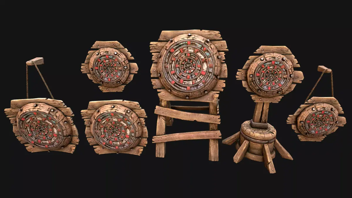Game ready models .The models contains lods, detailed information on the images.Stylized and detailed Medieval Wooden Target set fully textured, sculpted and rendered with Physical based rendering (PBR) - Shown images have been rendered in Marmoset Toolbag .The set contains 6 target models.