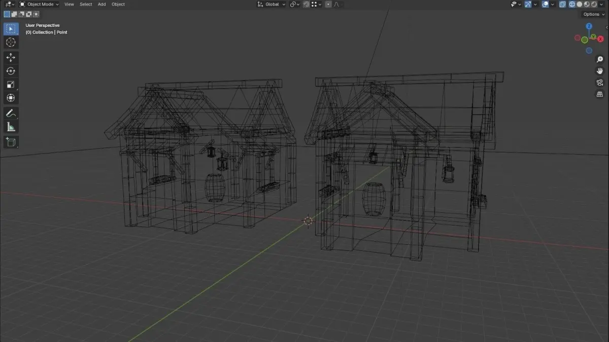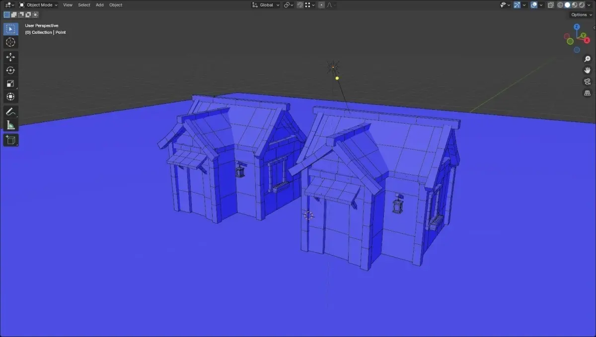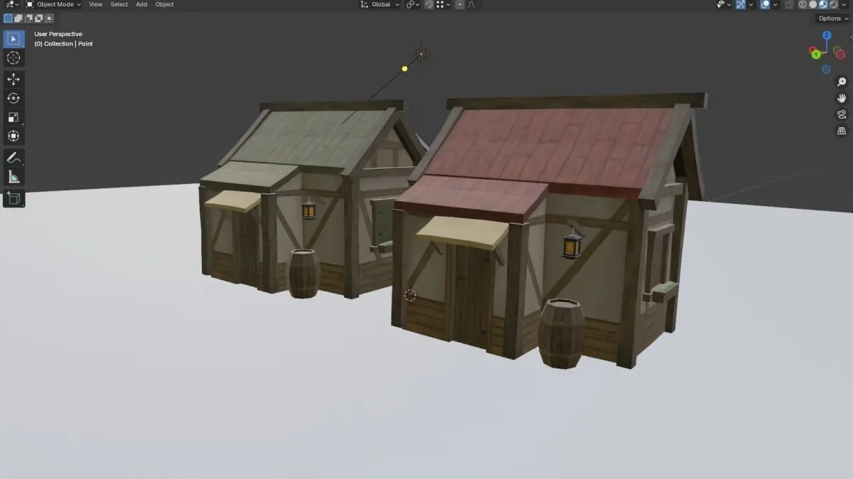 The model consists of the house, doors, windows, roof, lamps, all combined into one model. But there is a wooden barrel that is a separate model.