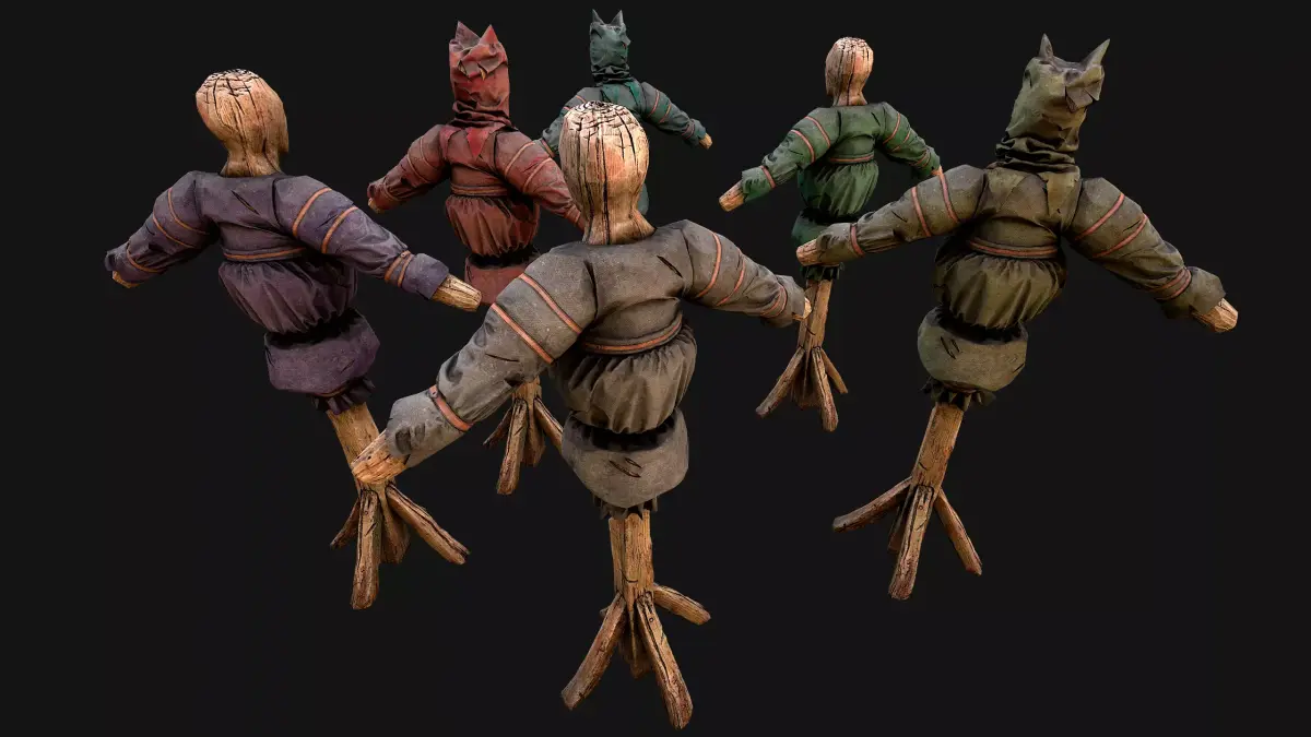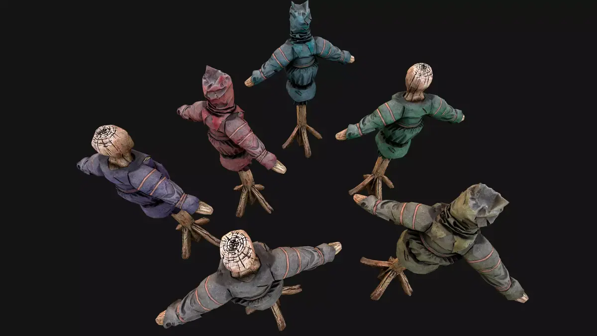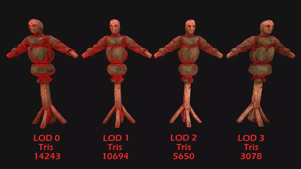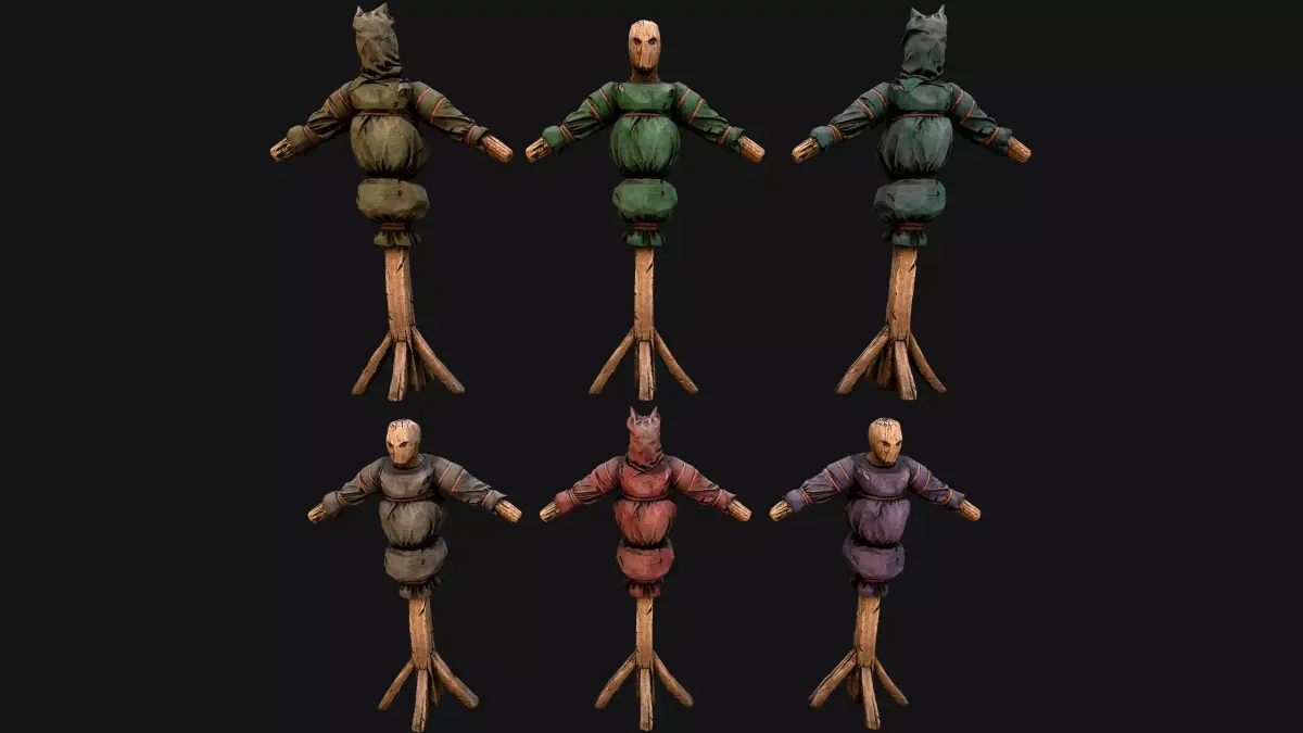 Game ready models .The model contains lods, detailed information on the images.Stylized and detailed Medieval Military Training Dummy fully textured, sculpted and rendered with Physical based rendering (PBR) - Shown images have been rendered in Marmoset Toolbag .The set contains two: a mannequin and a mannequin with a headdress.The mannequin has 6 color options.