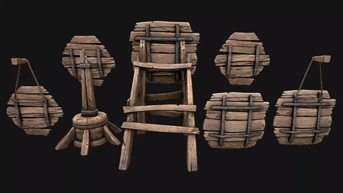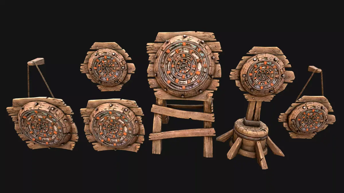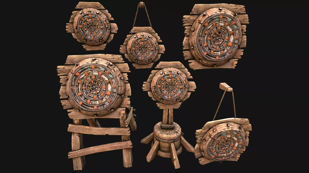 Game ready models .The models contains lods, detailed information on the images.Stylized and detailed Medieval Wooden Target set fully textured, sculpted and rendered with Physical based rendering (PBR) - Shown images have been rendered in Marmoset Toolbag .The set contains 6 target models.