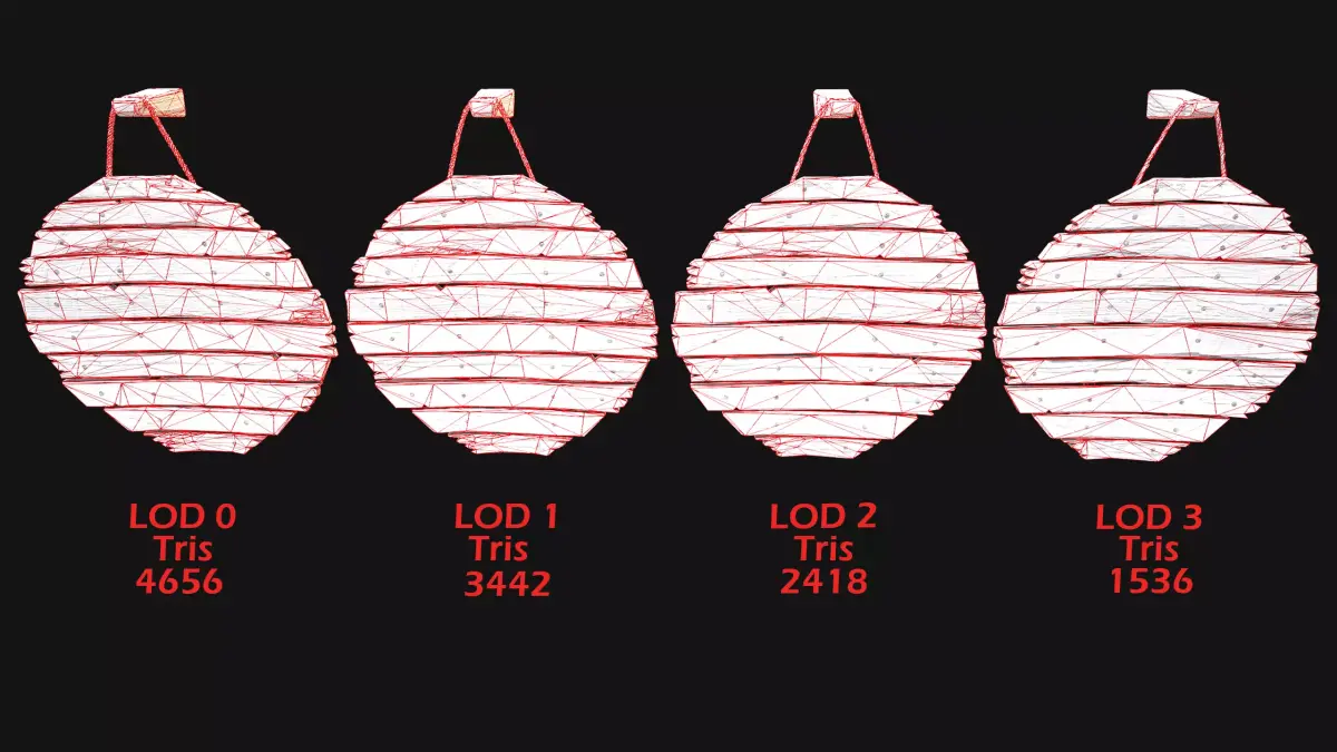 - Edges: 6984(LOD0),5163(LOD1),3628(LOD2),2304(LOD3).