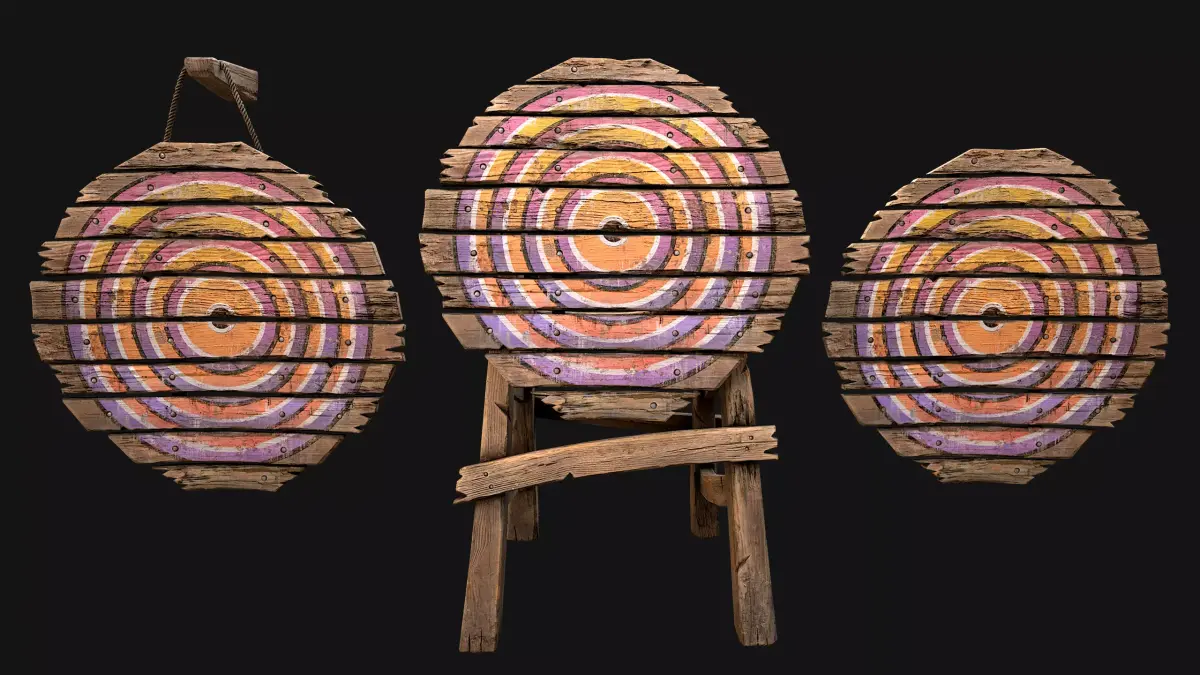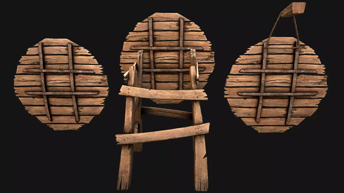 Game ready models .The models contains lods, detailed information on the images.Stylized and detailed Medieval Wooden Target fully textured, sculpted and rendered with Physical based rendering (PBR) - Shown images have been rendered in Marmoset Toolbag .The set contains: Target, target on a rope, target on a wooden stand.