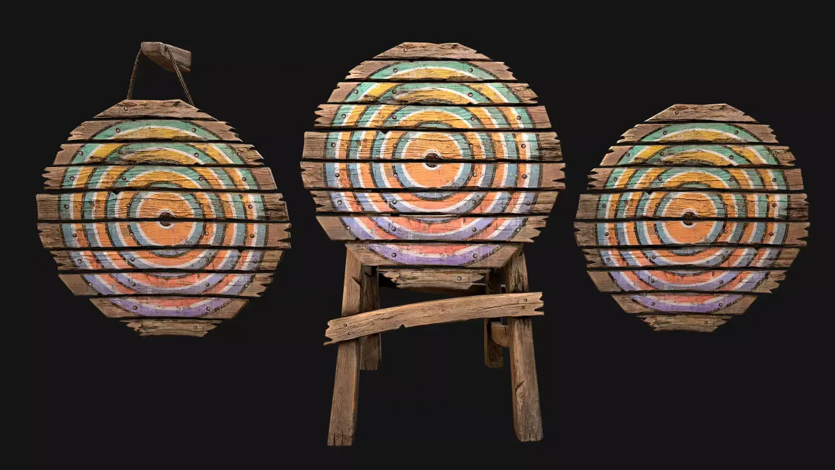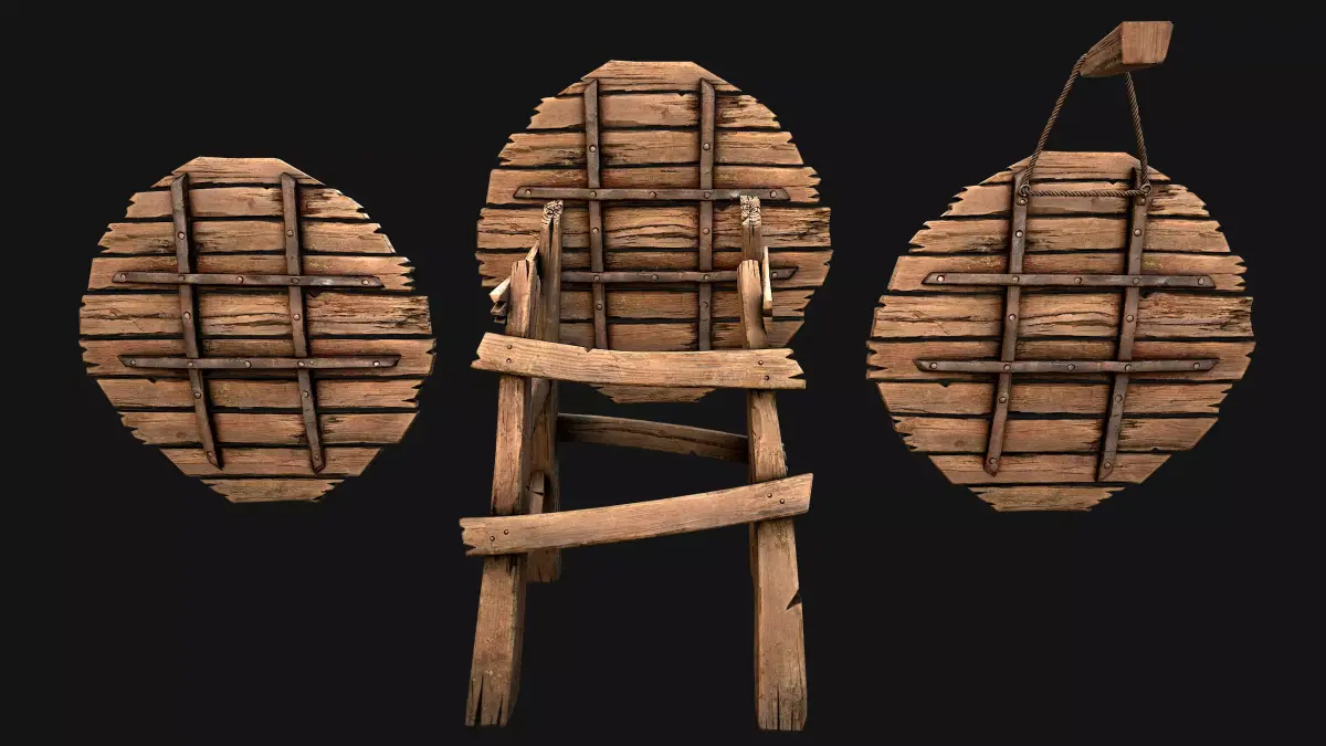 Game ready models .The models contains lods, detailed information on the images.Stylized and detailed Medieval Wooden Target fully textured, sculpted and rendered with Physical based rendering (PBR) - Shown images have been rendered in Marmoset Toolbag .The set contains: Target, target on a rope, target on a wooden stand.