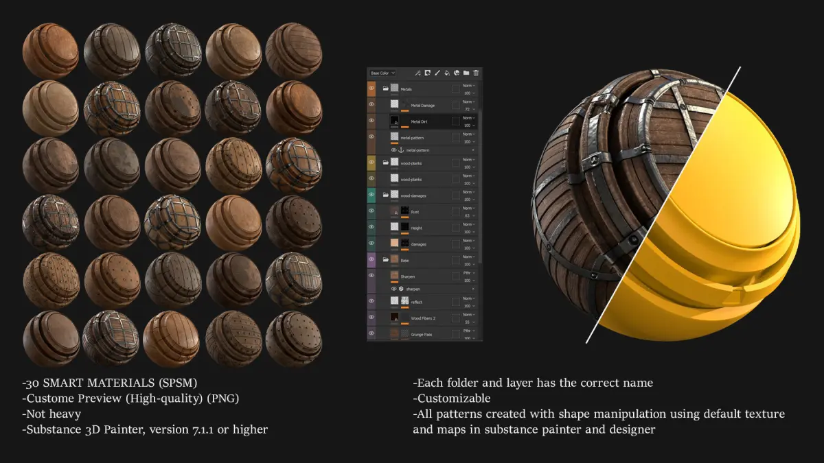 30 SMART MATERIALS Each folder and layer has the correct nameNot heavyCustomizable100% made with substance painter and designerAlso you can make these changes on metals: