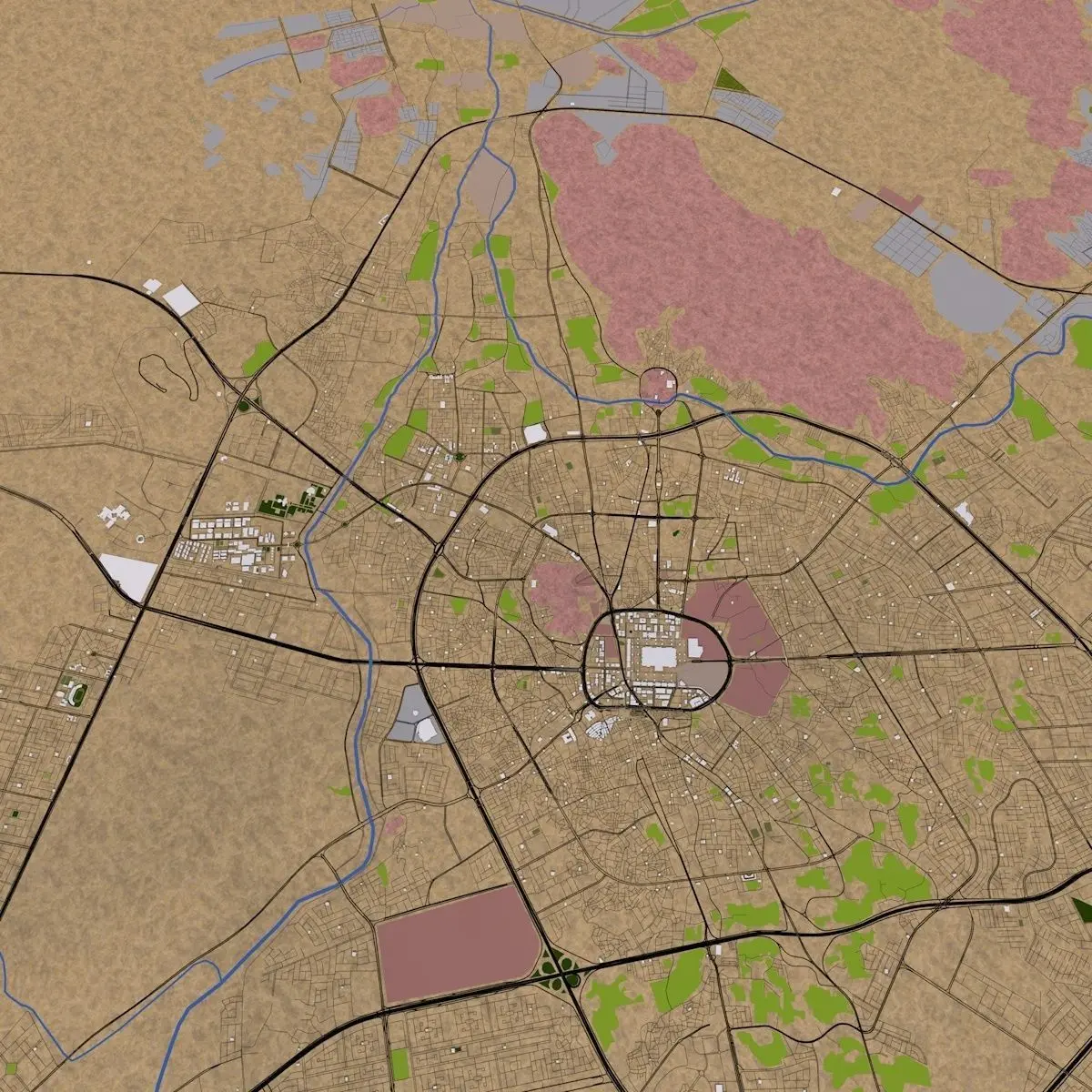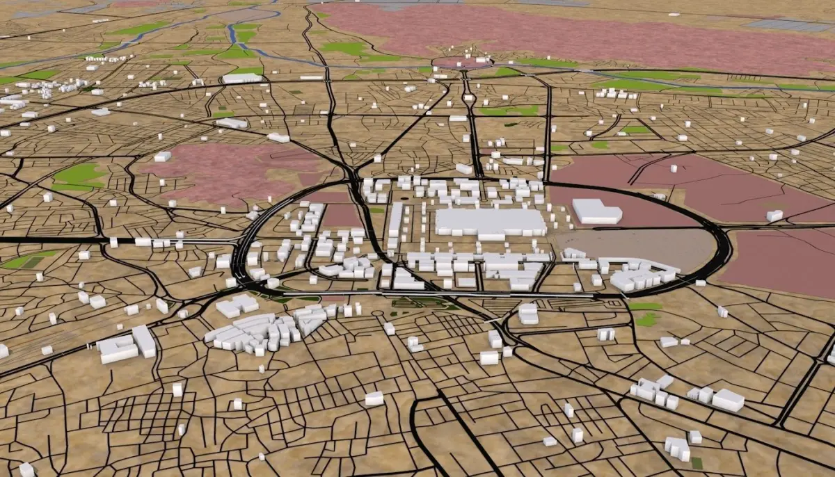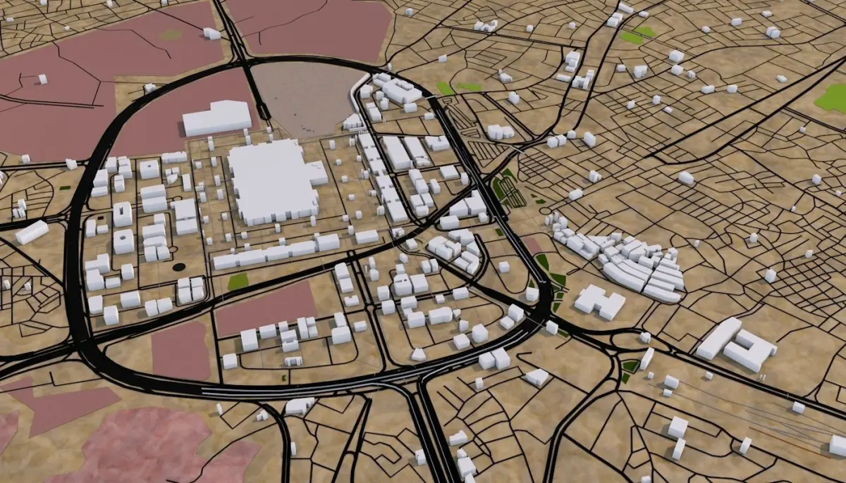 3D representation of Medina City Saudi Arabiausing 2019 map data. Roads, railway, land, water, buildings are made using real world data. Buildings are accurately placed and resembles the real world object up to some extend. Please note that random buildings (varying height) are added to those area where real world data is not available.
