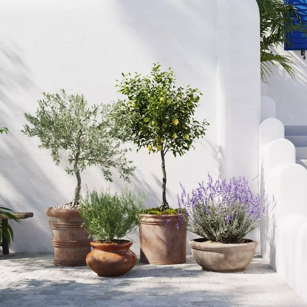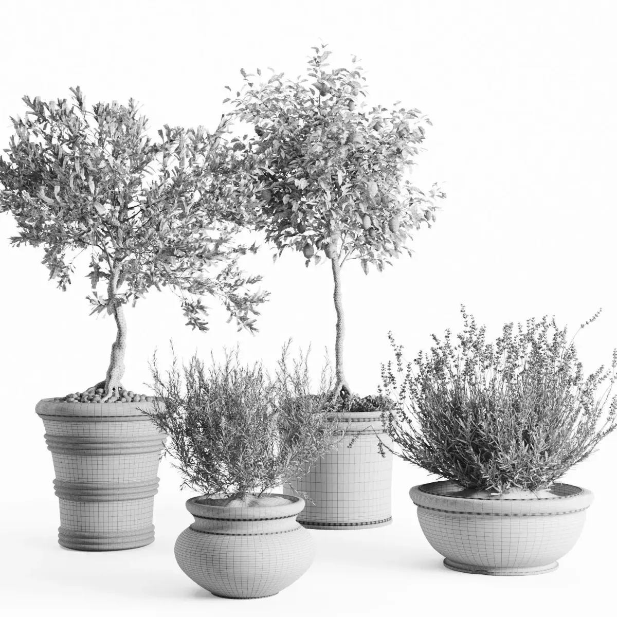 This collection includes four high-quality 3D models of Mediterranean plants: olive tree, lemon tree, lavender, and rosemary, each placed in carefully designed ceramic pots. The models are optimized for architectural visualization and close-up renders, with realistic materials and detailed foliage.